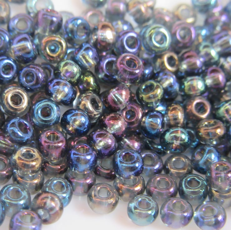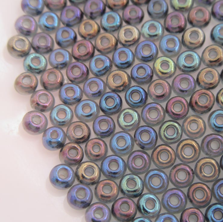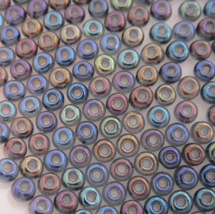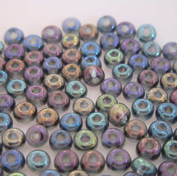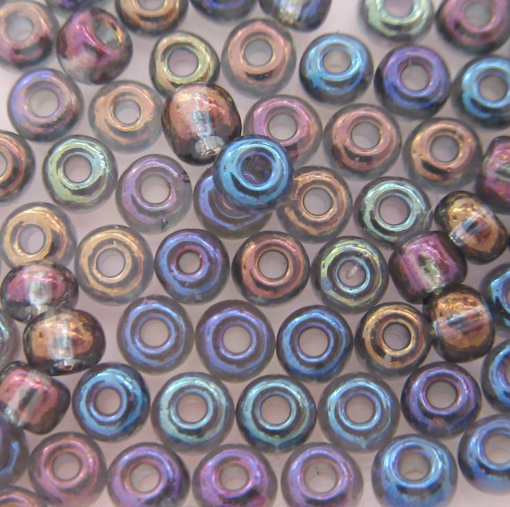 Clear glass beads with a slight purple tinge and an iridescent surface, giving them a multicoloured appearance.