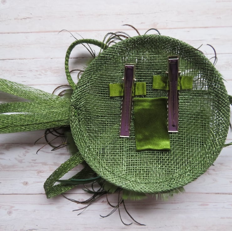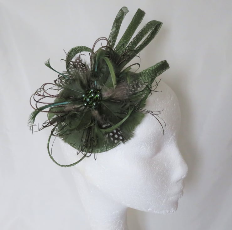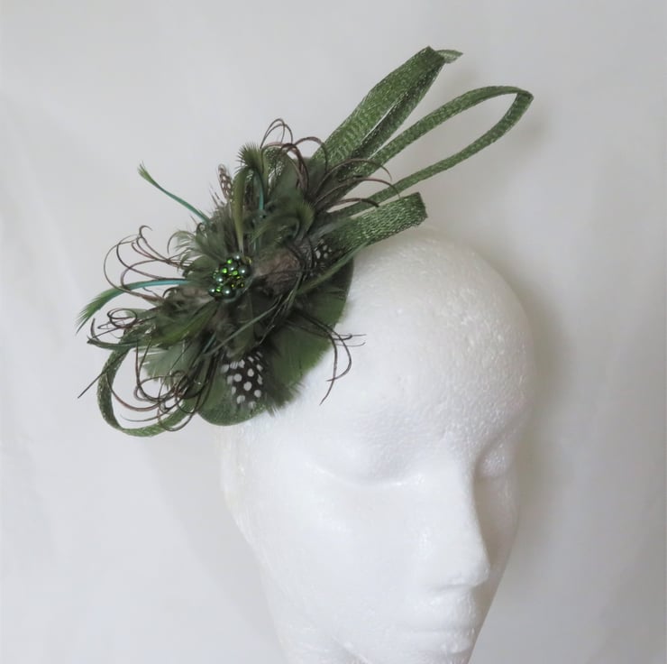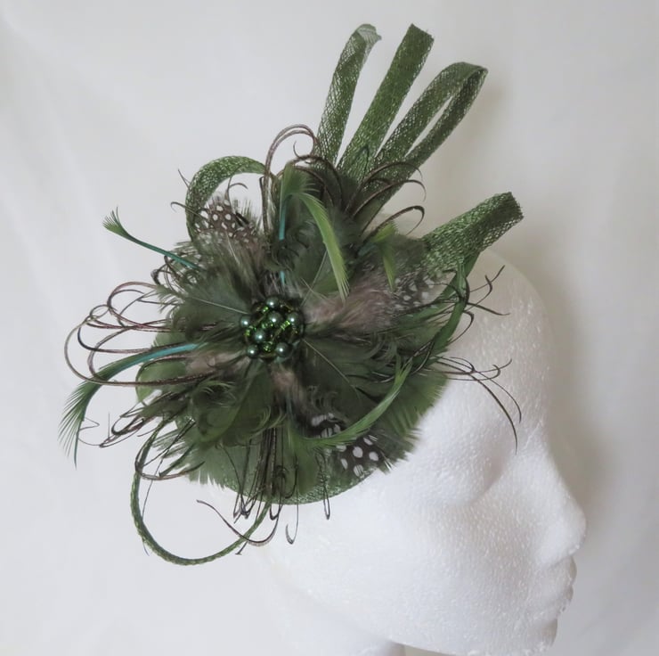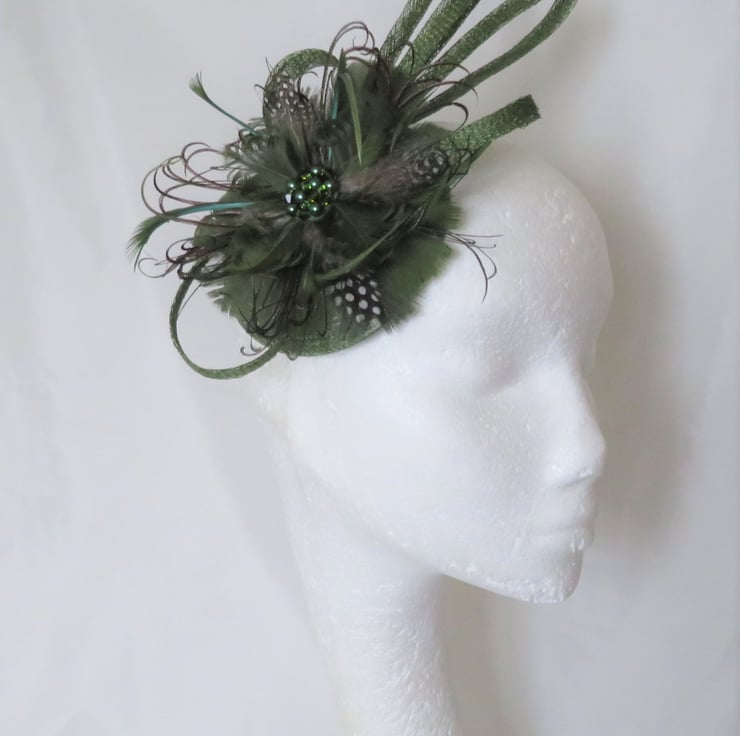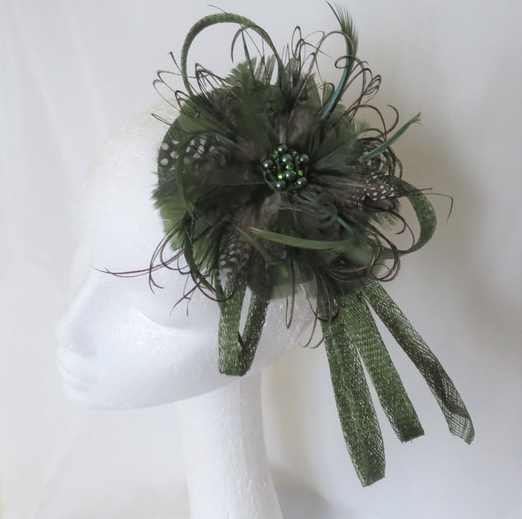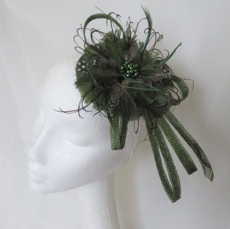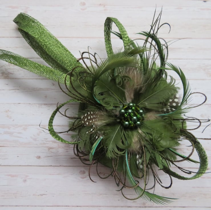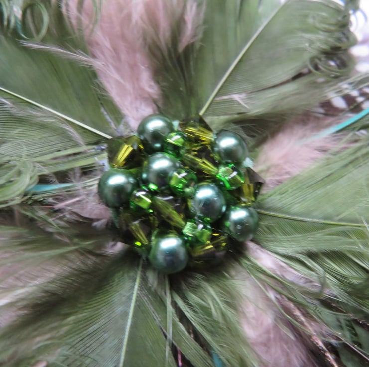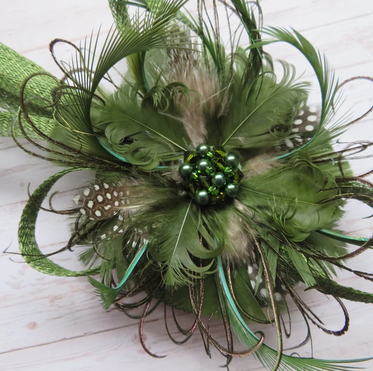 Finished with a handmade feather flower, created using moss green goose nagoire feathers,olive biots, peacock flume fronds and spotted mink guinea fowl feathers and finished a handsewn beaded round cluster with dark green glass pearls, olive bicone glass crystals & paler green glass bugle beads.