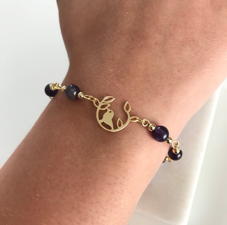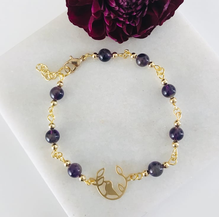 Pretty bracelet made with 6mm amethyst gemstone beads surrounded by small gold plated beads and a gold plated bird connector.