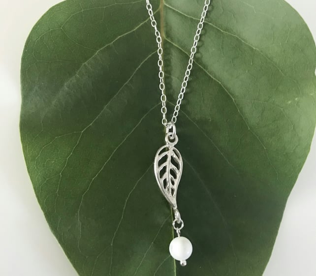 Sterling silver leaf charm hung on a 18” sterling silver trace chain. The necklace is completed with a white mother of pearl gemstone bead.
