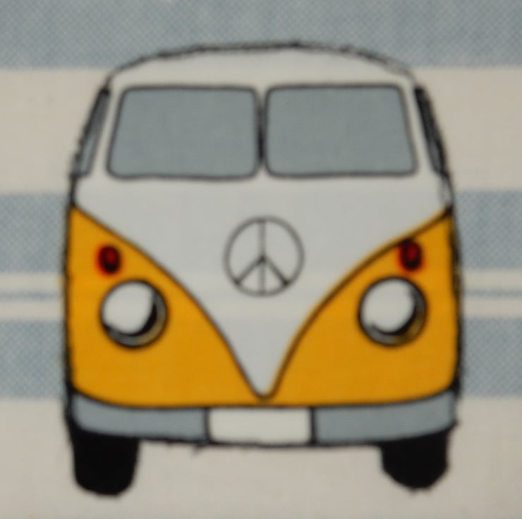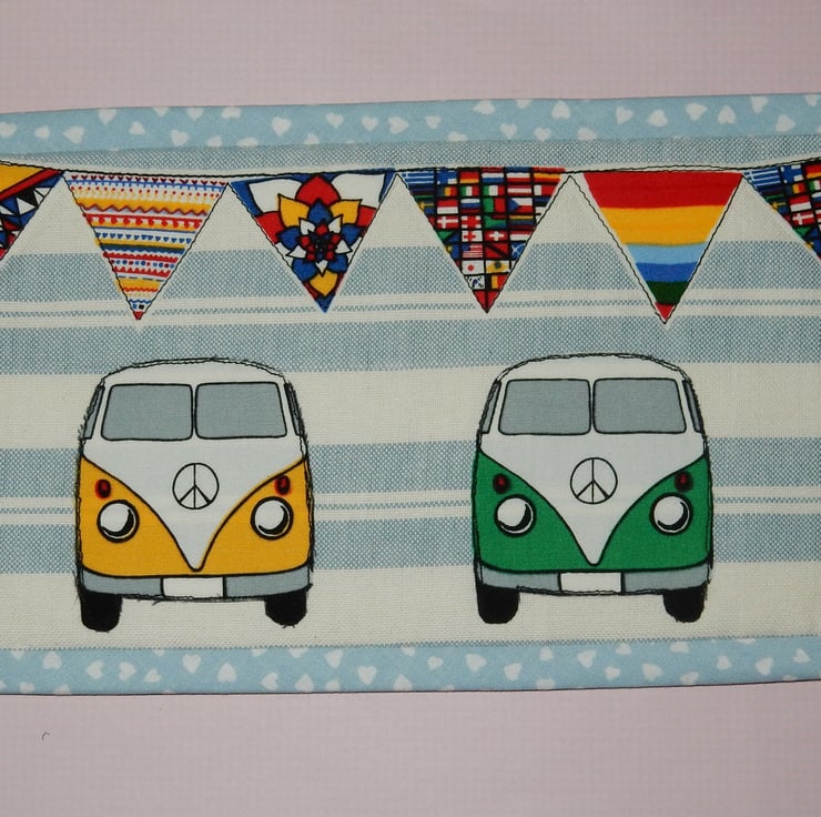 Any lovers of campervans? This mug rug is a larger version of a coaster, designed to take a mug and a biscuit or snack, it measures 9 x 5.5 inches. This one features two campervans side by side with bunting above, maybe they are at a campervan rally?. It could be used as a table centre, or decoration. It is made from woven fabric, with a toning fabric on the reverse and a layer of cotton wadding inside.