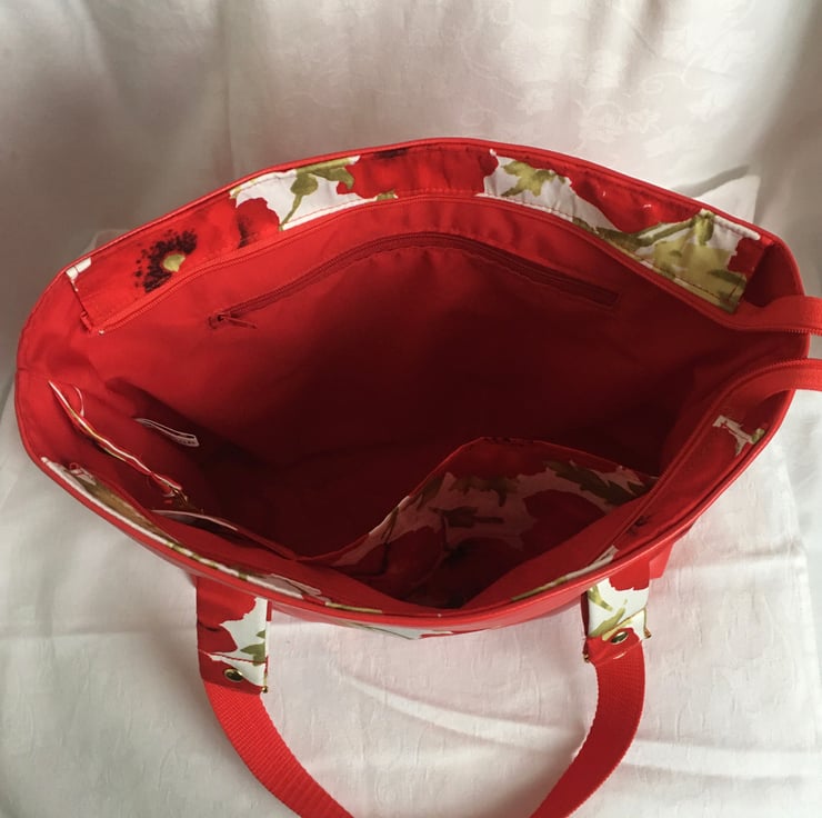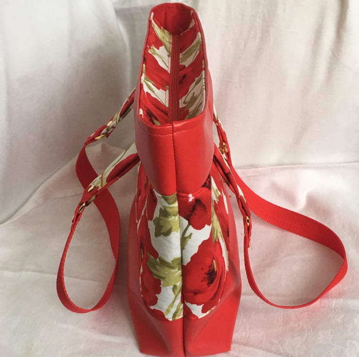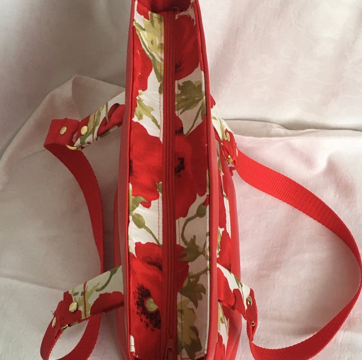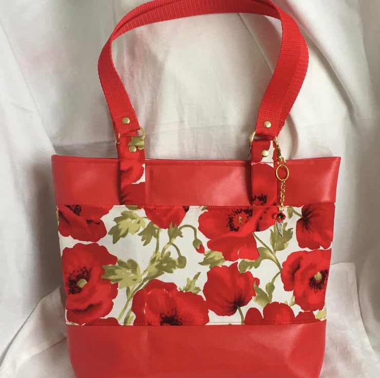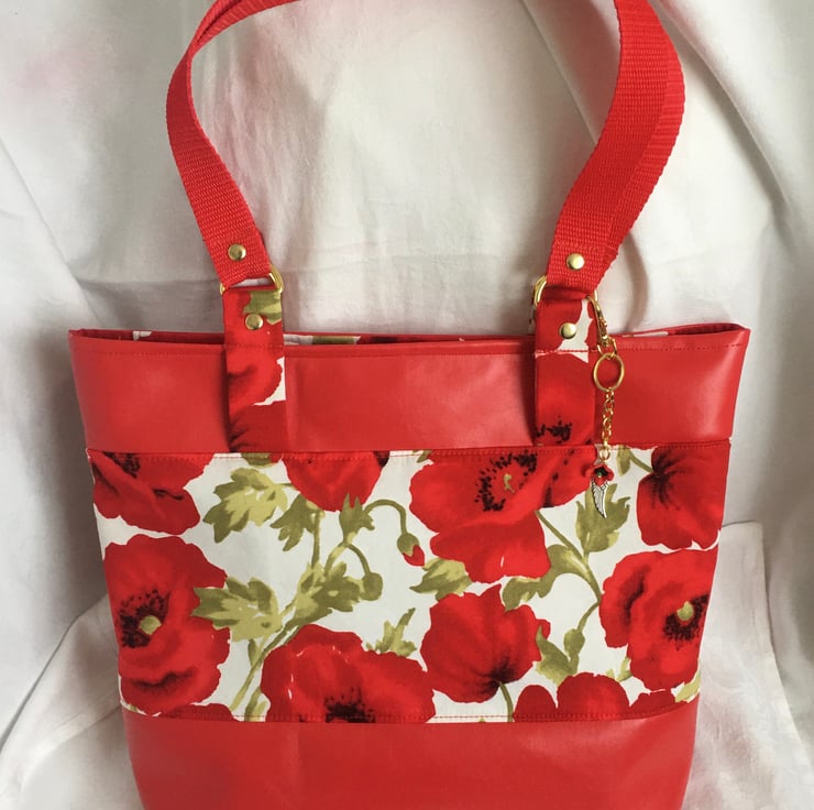 The bag has been made from red faux leather and Poppy print heavy weight cotton fabric, which has been backed with stabilizer. The lining is an dense weave cotton fabric and the handles nylon webbing, giving strength and stability. The bag not only boasts of a large internal area, it has two additional pockets internally and the main bag is secured with a top zip. Bag comes with a clip charm comprising of a Poppy and Feather.