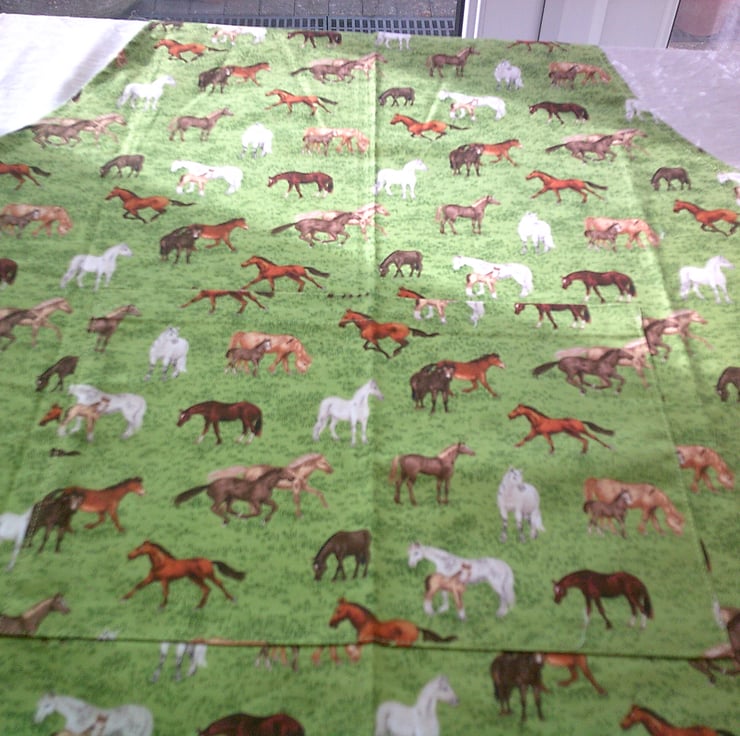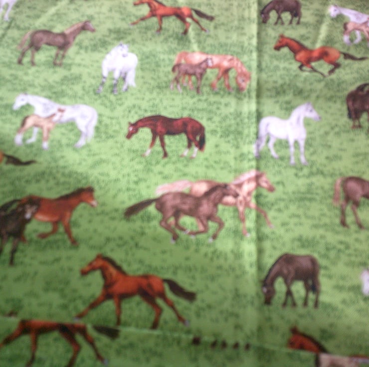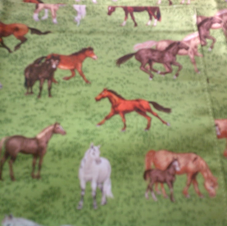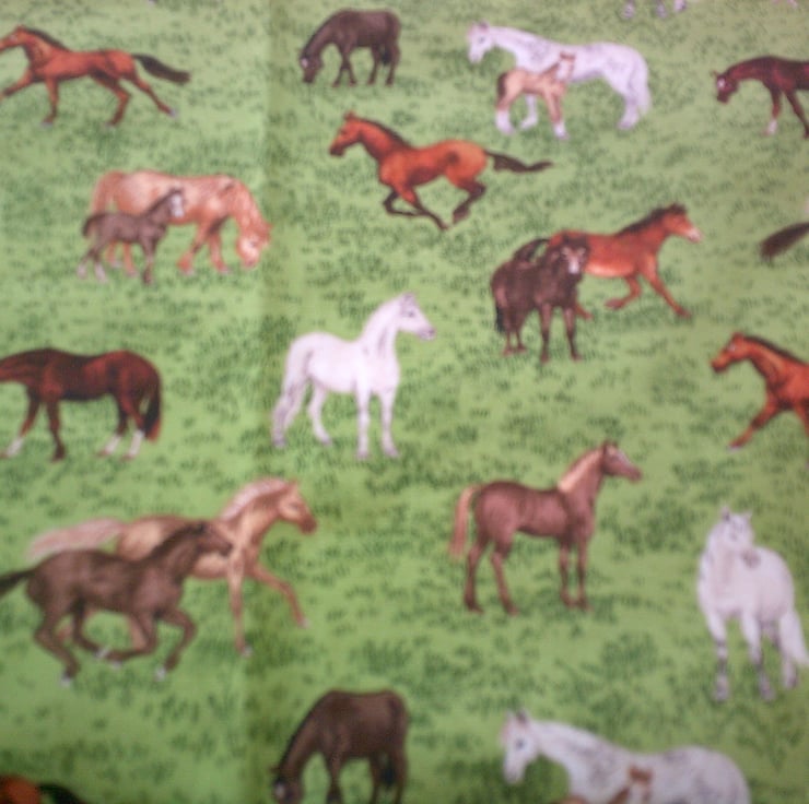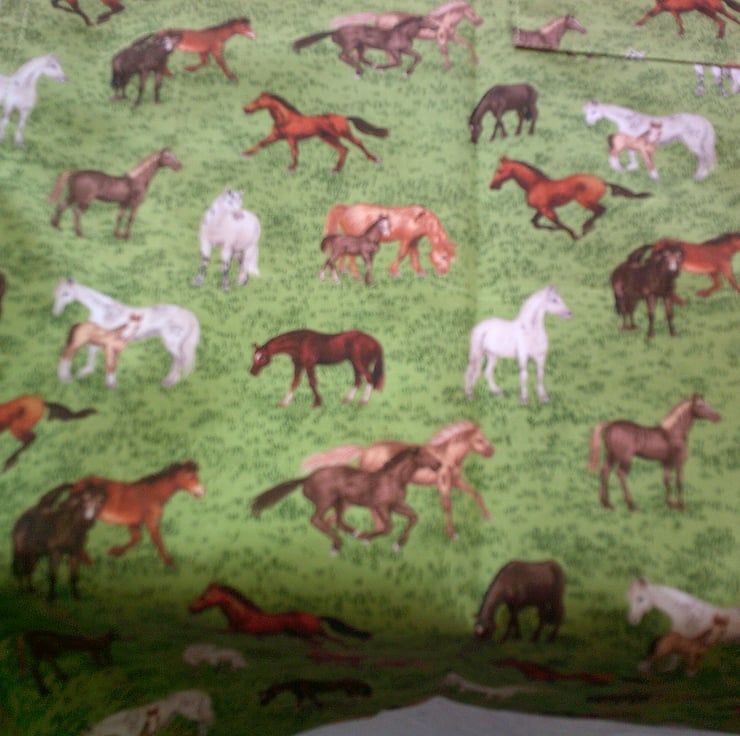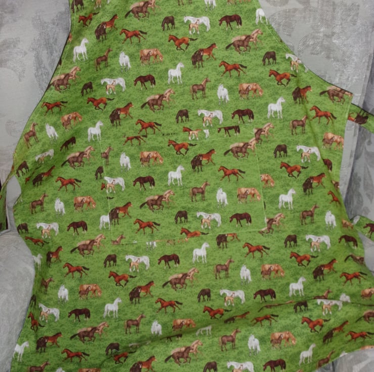The design on this apron is small horses in a variety of colours including brown, black and white.