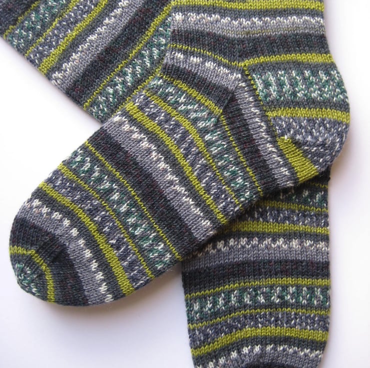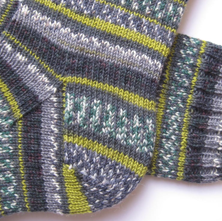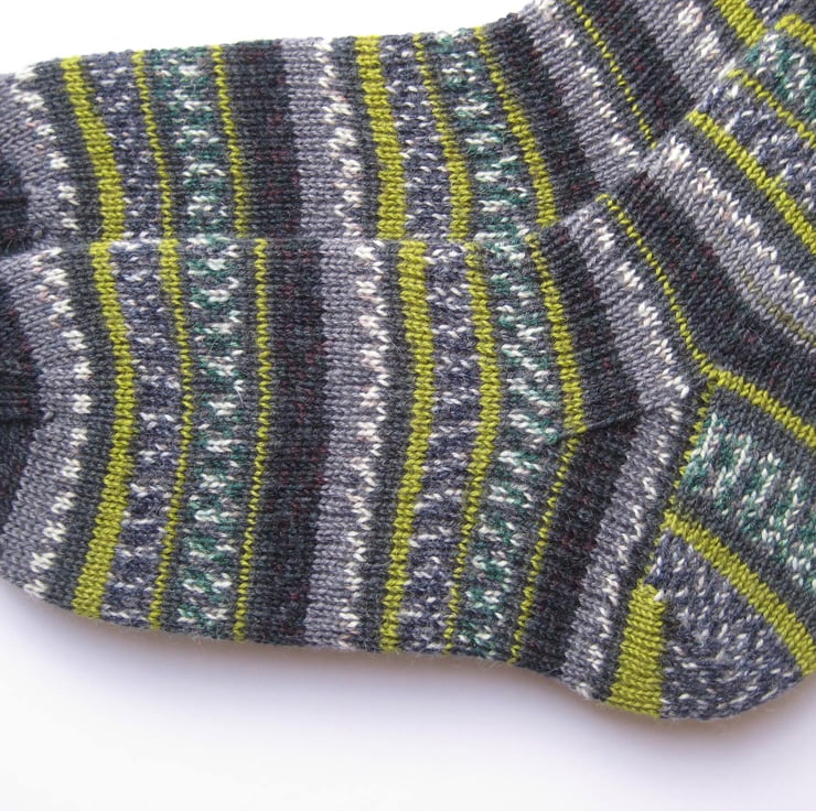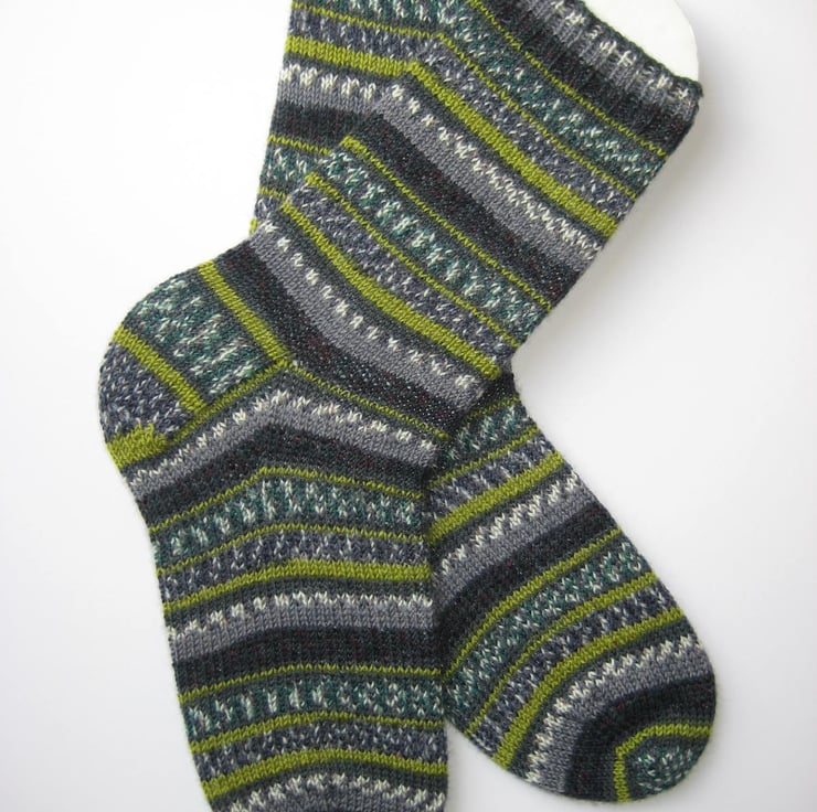 Hand knitted in the round on 5 double pointed needles, these wool socks are made from Regia 4 ply self patterning sock yarn (75% wool 25% polyamide) in shades of green, grey and off-white patterns and stripes (colours best depicted in photo 5). Made from very fine yarn, they are not thick and will fit most footwear. Warm and durable, these socks will keep your feet comfortable and bright throughout the year.