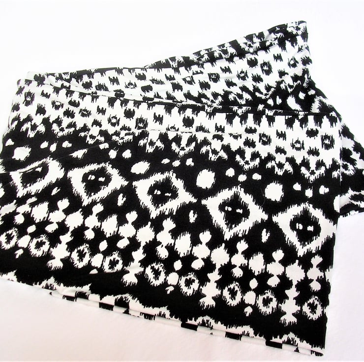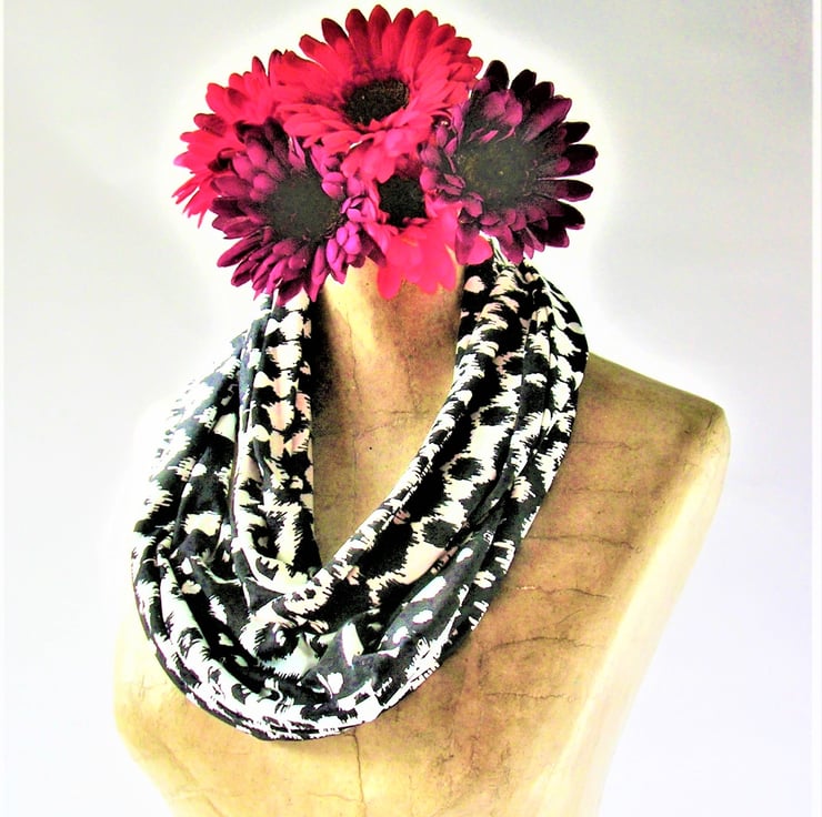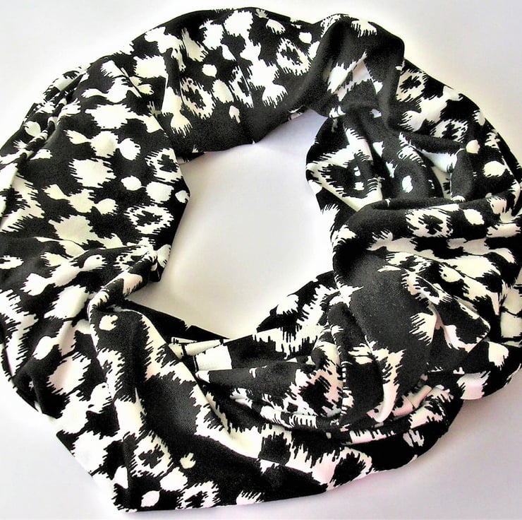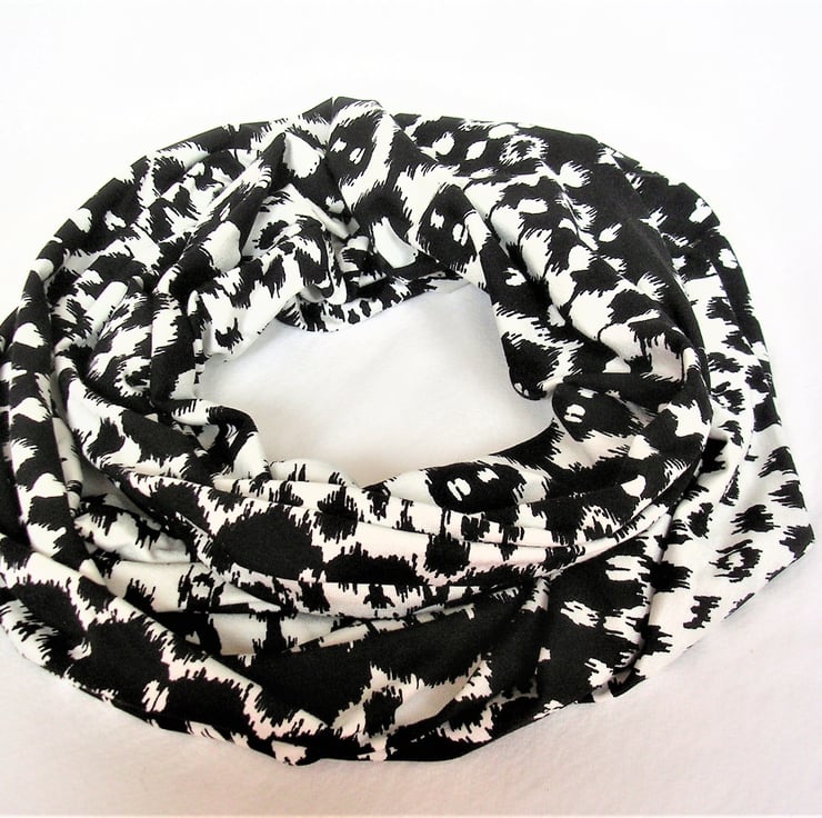 Black and White Jersey Infinity Double Loop Scarf in an abstract print