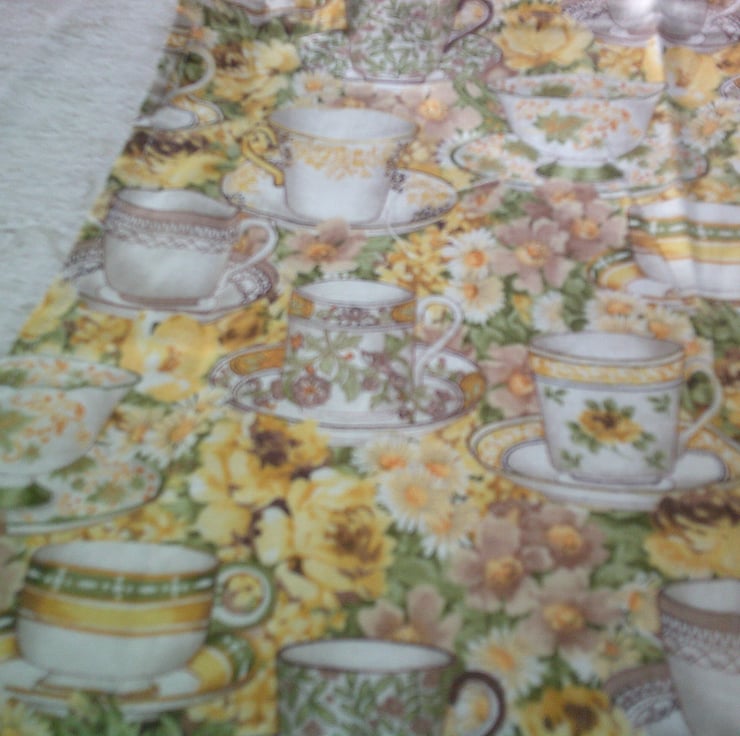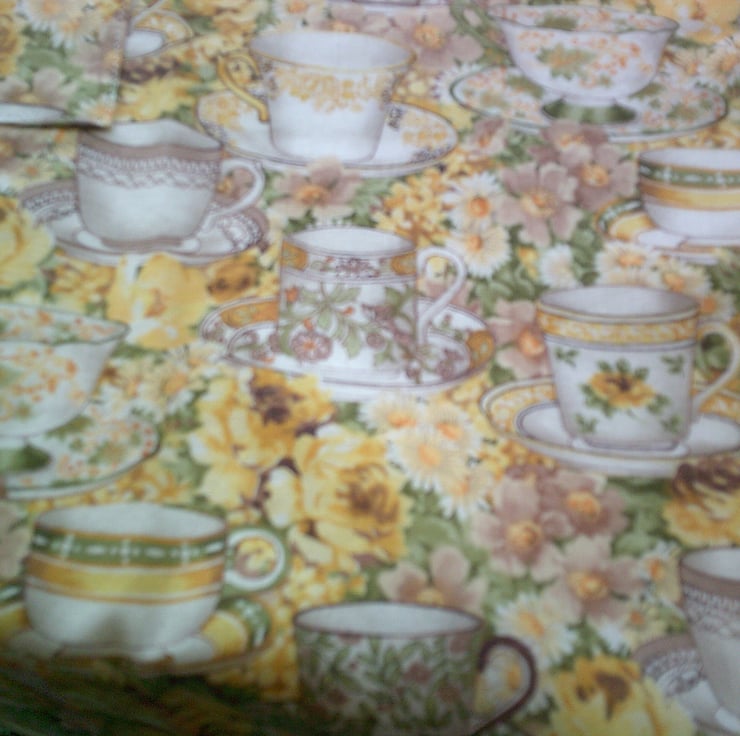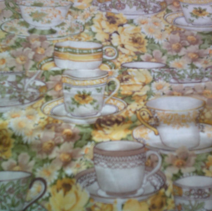 The design features an array of cups and saucers in a various shades of yellow and white surrounded by with yellow flowers.