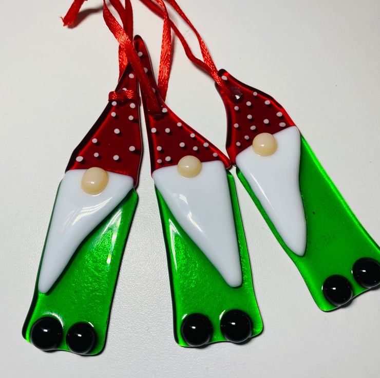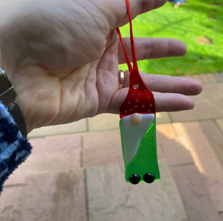 Hanging fused glass gnomes in red and green . Perfect for your Christmas tree or as gifts for family members . The gnomes are beautifully contoured and tactile. Very cute . They are approximately 3 inch long and 1 inch wide .