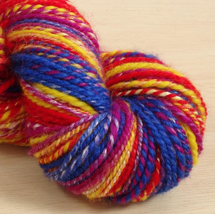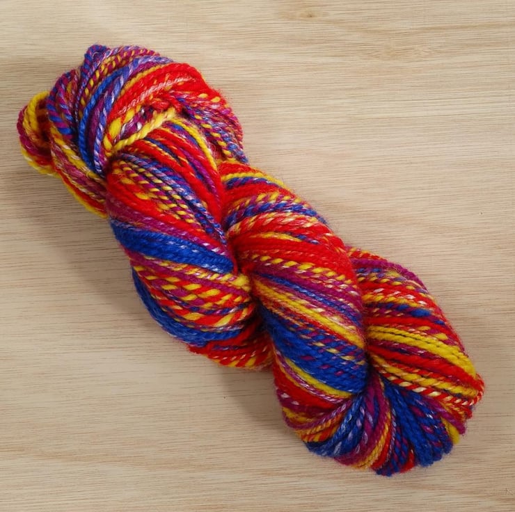 Circus is a bright and colourful yarn that has been hand spun on Arwen, my Kromski Fantasia spinning wheel. It is a semi-striping yarn - at points you will get the same colour in both plies and at other points the colours will barber pole around each other to create interesting effects. The colours will roughly follow the order red, yellow, purple, blue, blue, purple, yellow, red with small sections of paler or white between the colours in each ply.