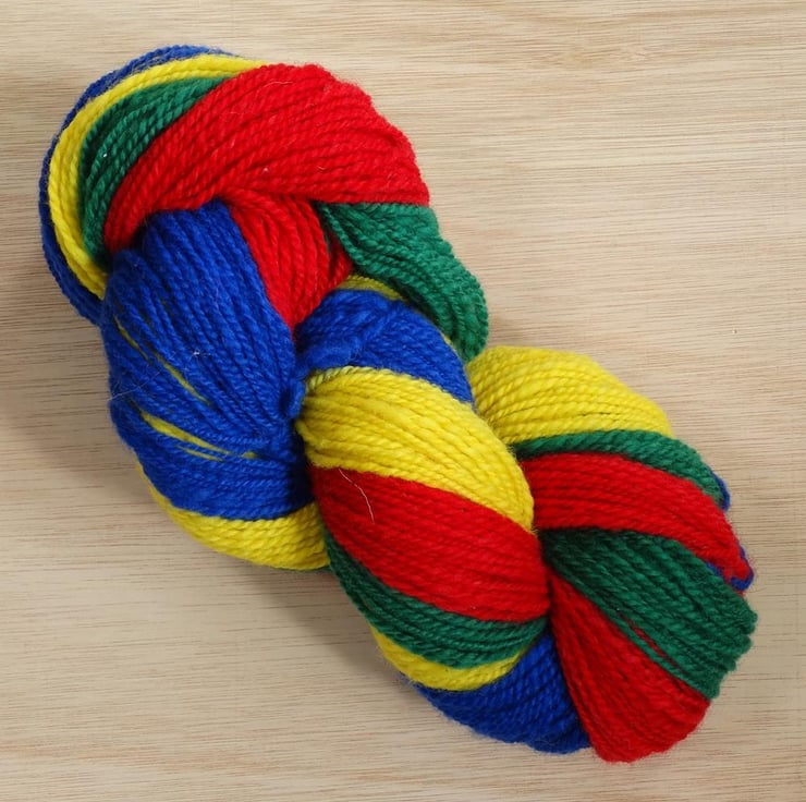 Clown is a bright and bold yarn that has been hand spun on Arwen, my Kromski Fantasia spinning wheel. When used, you'll use all of one colour before moving on to the next to create four bold stripes in the order of red, green, yellow and blue.. The colour changes are sudden and there is only a small amount of overlap between the colours.