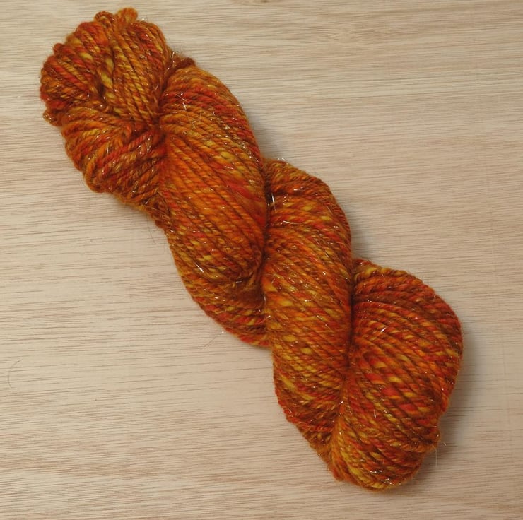 Fire Eater is a sparkly, warm yarn that has been hand spun on Arwen, my Kromski Fantasia spinning wheel. It is a tonal blend with four colours of wool in a dark, rusty red, through a brighter red into orange and finally into a golden yellow. A touch of gold really brings the shine and sparkle into this fire!