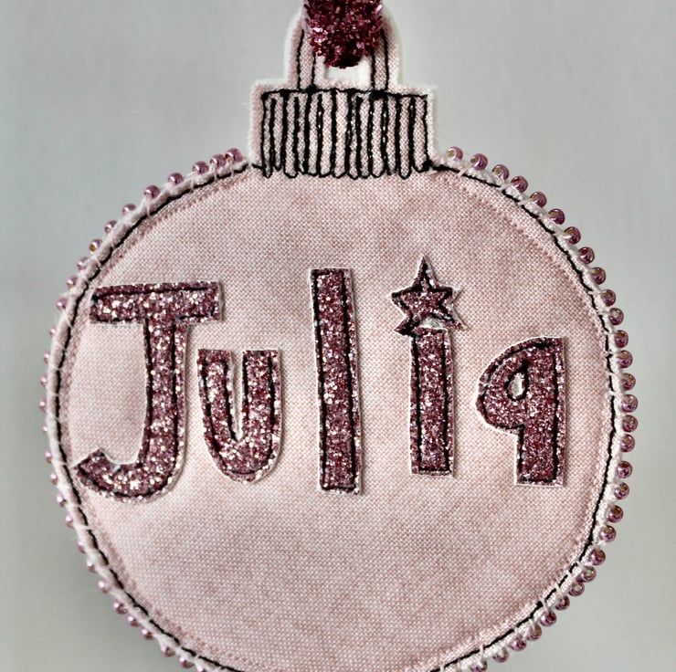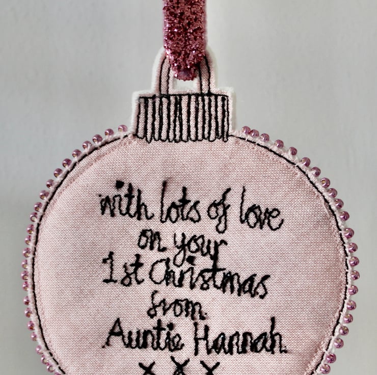A cotton and wool felt bauble with your chosen name on one side and the words 'with lots of love on your 1st Christmas from...............................xxx'