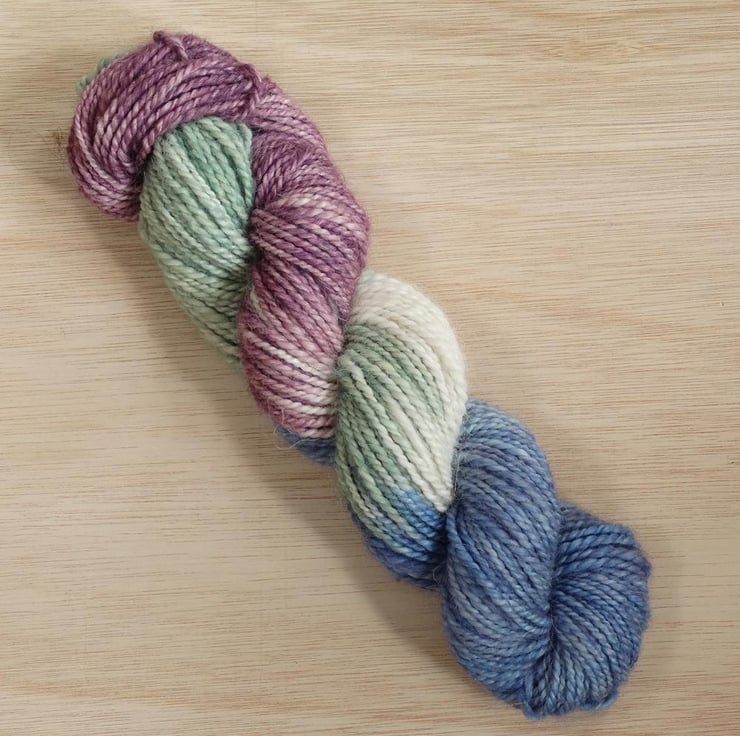 Horse is a beautiful yarn that has been hand spun on Arwen, my Kromski Fantasia spinning wheel. The yarn has been dyed to include shades of deep purple, dusky blue and pale green. When used, it will create small stripes of each colour. It would pair nicely with my Circus Zebra colourway from the same collection.