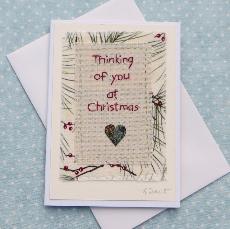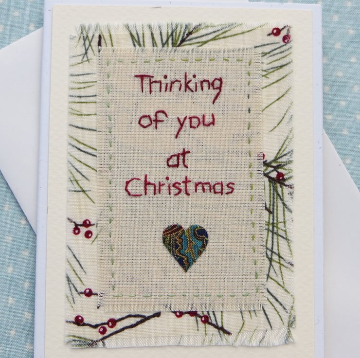 This is a hand-stitched miniature textile mounted onto greeting card. I have hand-stitched the words onto plain cotton adding a tiny applique heart. The central panel is stitched to a pretty starry pine tree fabric.