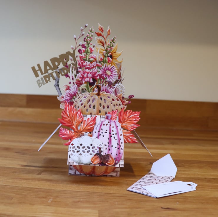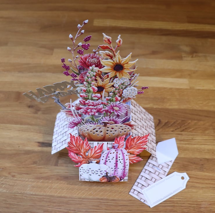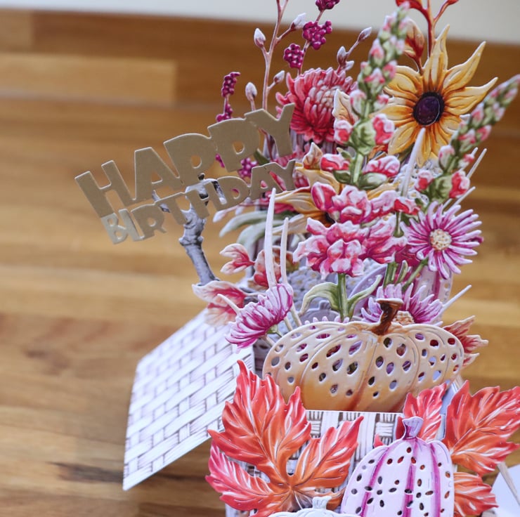 This is to celebrate an Autumn/ Winter Birthday with the last blooms of the year, there are even pumpkins and the tree branch holds the Happy Birthday sign.