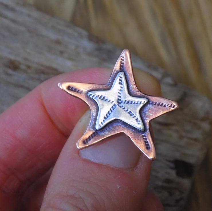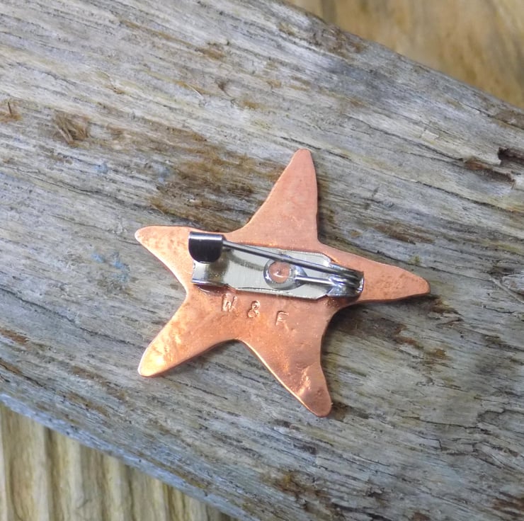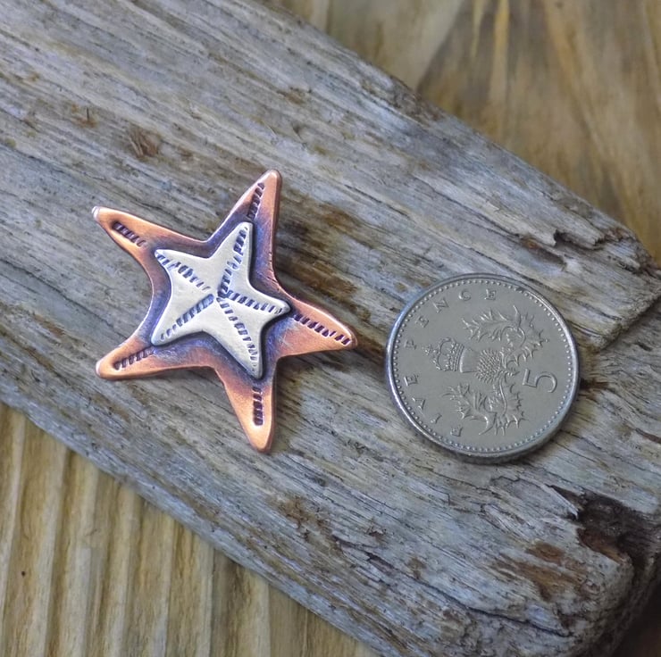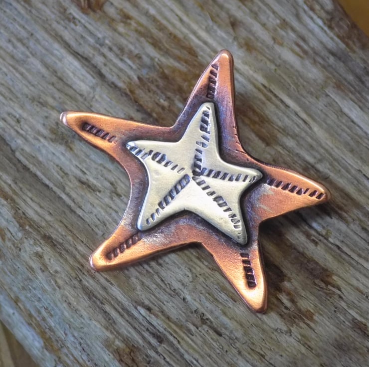 Made from copper and sterling silver sheet. A silver starfish has been sawn out and soldered onto a sawn out copper starfish , sanded and given a little texture. Given an aged finish to pick out the detail. A small brooch setting has been fixed to the back with strong jewellers glue.