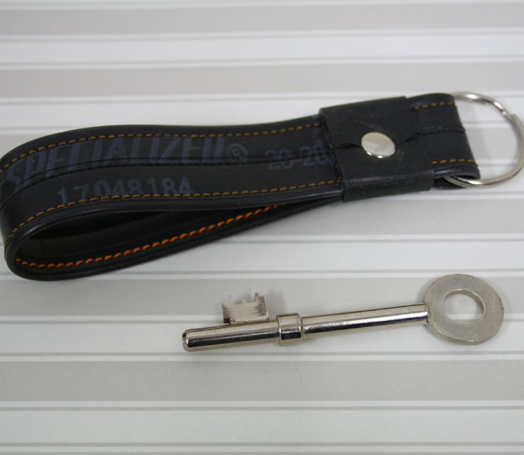 The upcycled inner tubes are washed, then cut and stitched using different colour thread on a sewing machine. A metal rivet holds the band together. The measurements are approximately 12.5cm long and 2.5cm wide. The spilt metal ring is 3cm diameter. Perfect for all cycling and recycling enthusiasts! This particular tube is from a Specialized make.