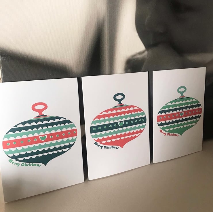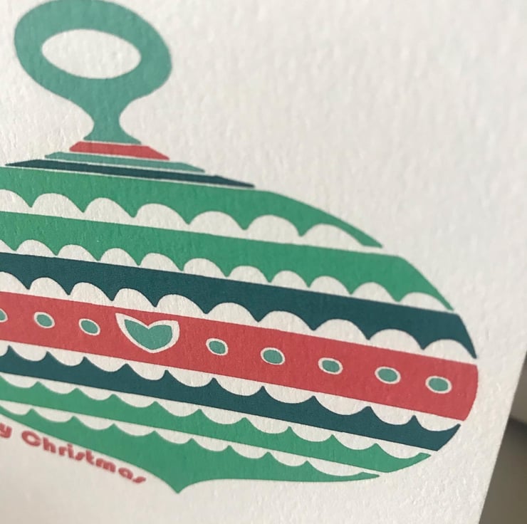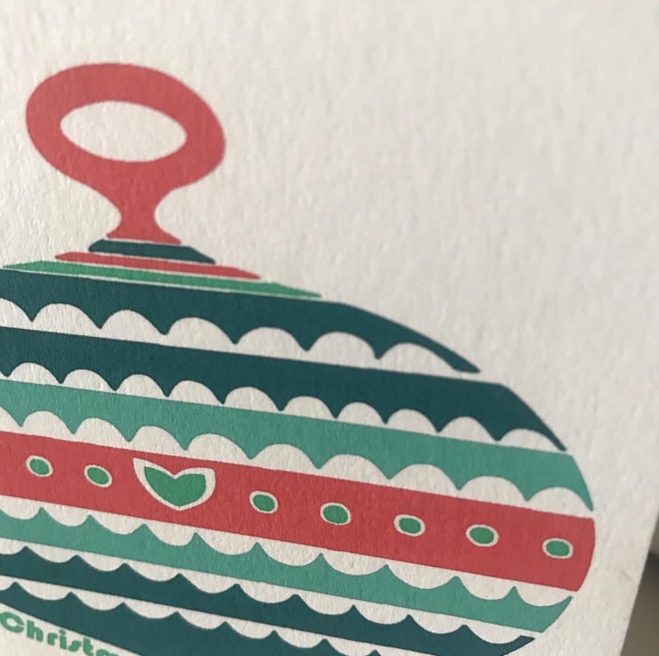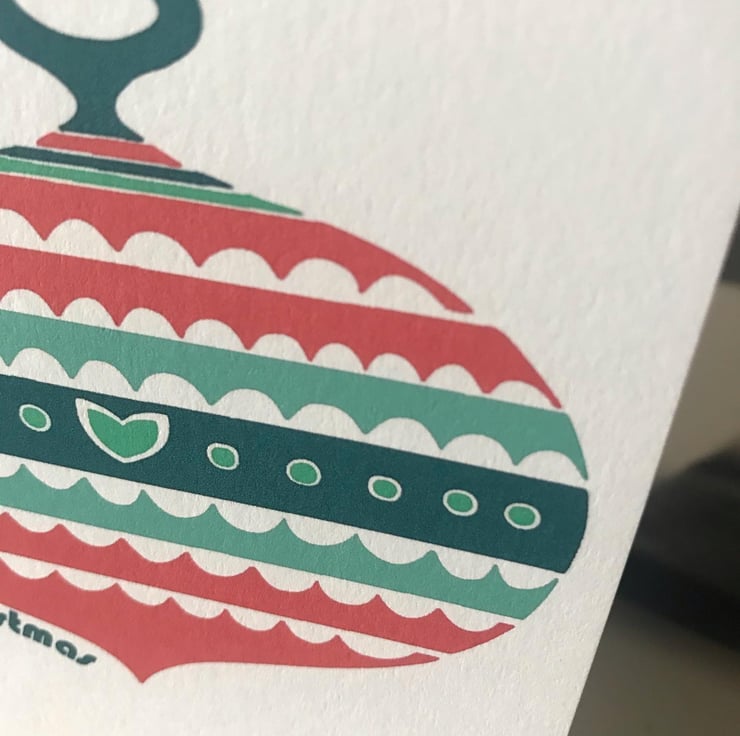 As with all my cards and prints the bauble design started life as a little sketch in my sketchbook, the design was then cut in lino and printed by me so the design has a beautiful, simple block print style that is retained in the final card design. All my designs are created in my little studio by the sea.