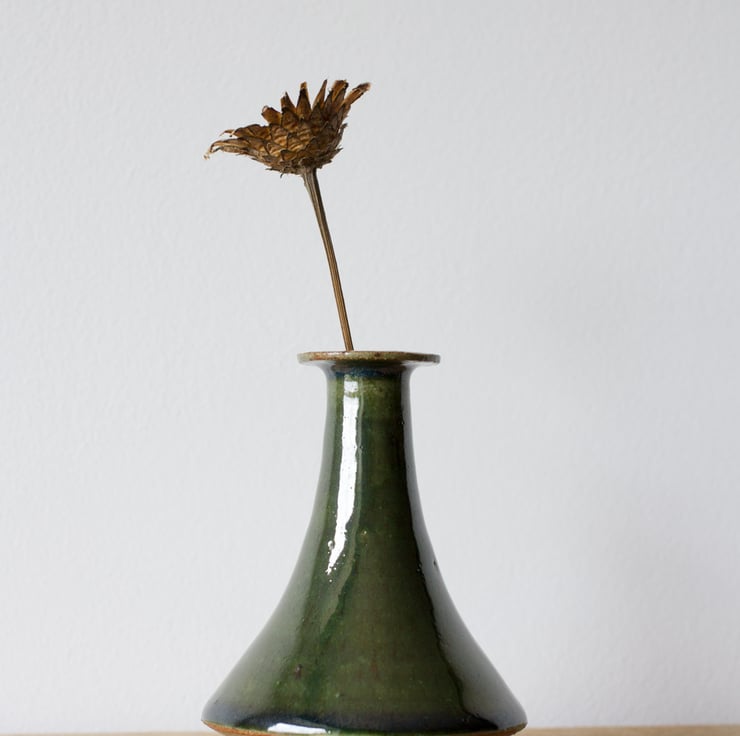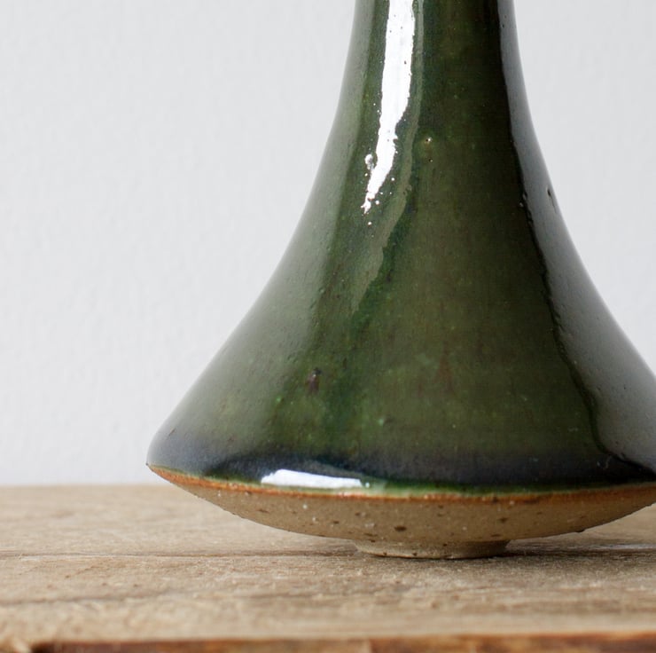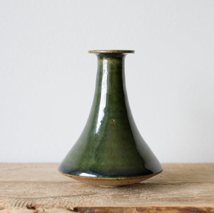 Small bud vase hand thrown on the pottery wheel and glazed in a rich green oribe glaze. The vase has a flared base the underside of which is left unglazed to show the raw texture of the lava fleck clay which contains small particles of iron. Glazed on the inside to allow it to hold water.