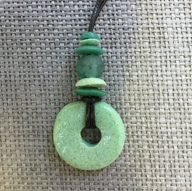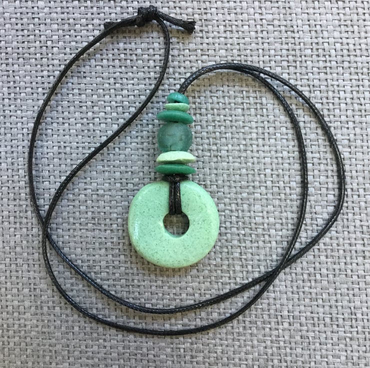 Pendant necklace featuring a large recycled glass disc, smaller recycled glass beads and a gorgeous opaque sea glass bead in shades of green, all strung on an black 2mm waxed cotton cord (soft and smooth with a slight sheen).