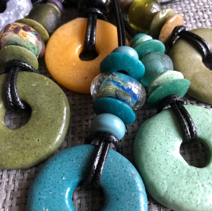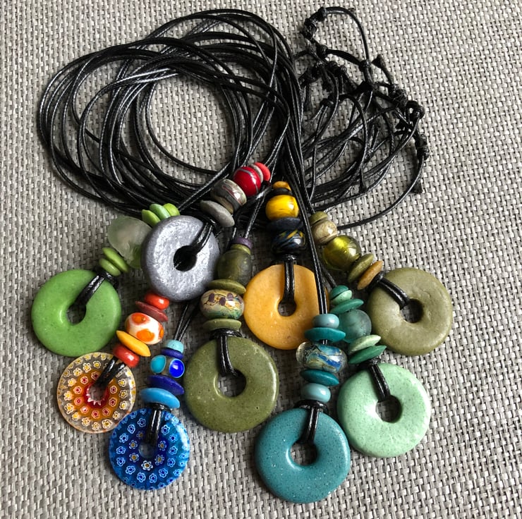 The circle is a symbol with many meanings, representing notions of totality, wholeness, the soul, timelessness and womanhood. I love the texture and unique colours of these glass beads and the fact that the beads are a mix of recycled and handmade. Fun to create and beautiful to wear.