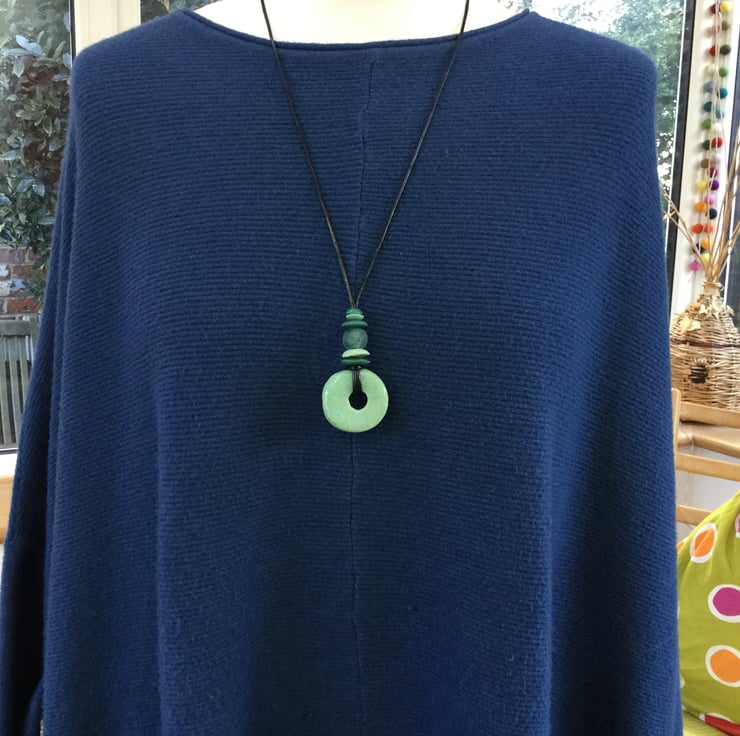 This pendant necklace is adjustable in length by sliding the two knotted ends away from each other or pulling them back together, so it can be worn as a lovely long pendant or a shorter necklace, and anything in between! The maximum drop on the necklace is approx 40 from the back of the neck to the bottom of the large glass disc.