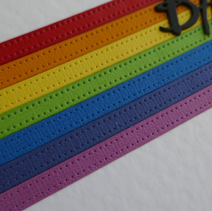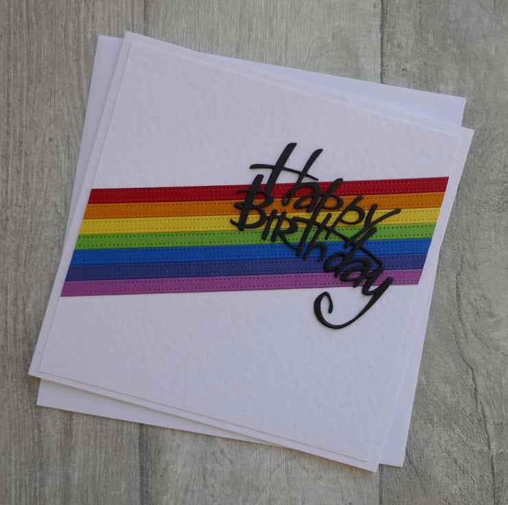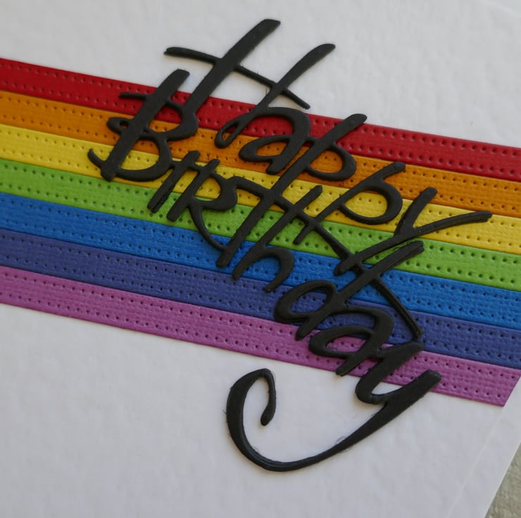 The front panel is slightly smaller than the card front and has seven stitched stripes in rainbow colours across it. The 'Happy Birthday' sentiment has been die cut from black card and attached across the stripes.