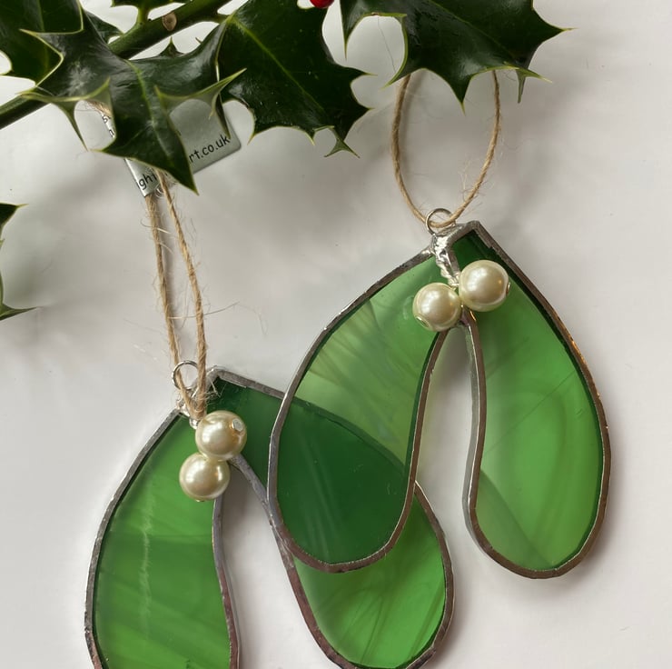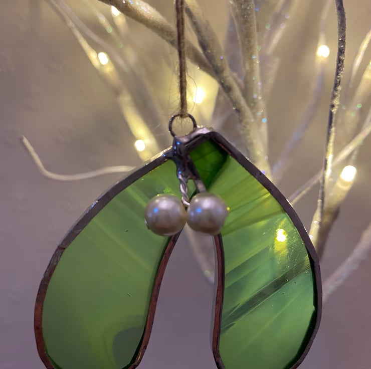 A beautiful stained glass misteltoe made using the Tiffany ( copper foiled ) method of stained glass . There are 2 leaves in a wispy green glass ( glass may vary slightly) and 2 pearl bead berries.