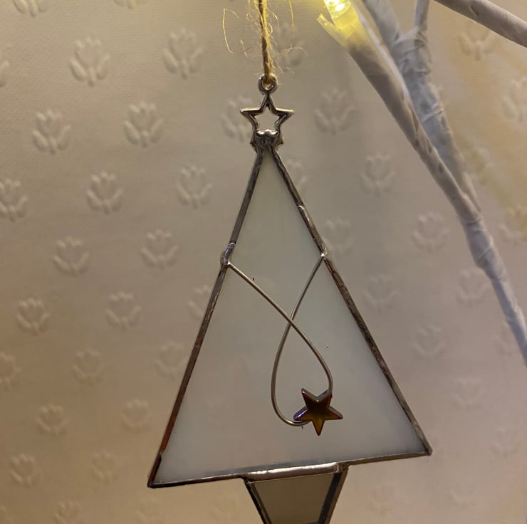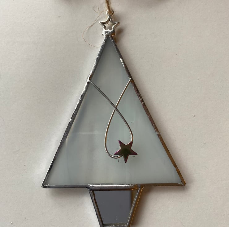 A beautiful stained glass Christmas Tree made using the Tiffany ( copper foiled ) method of stained glass . It is made in a white wispy glass with a silver mirror glass pot . It has a lovely silver colour sparkly star shaped bead on a wire twist .