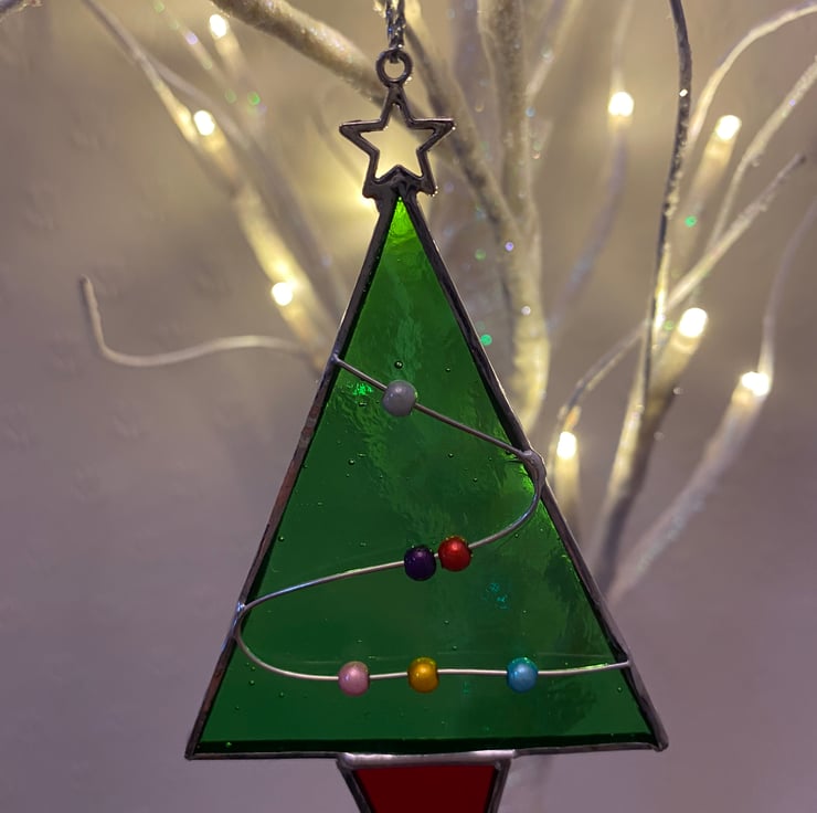 A beautiful stained glass Christmas Tree made using the Tiffany ( copper foiled ) method of stained glass . The tree is a lovely clear green glass with a red glass pot . Six small miracle beads adorn a wire twist ( colours may vary) . It has a small silver star on the top and a silver string hanging thread.