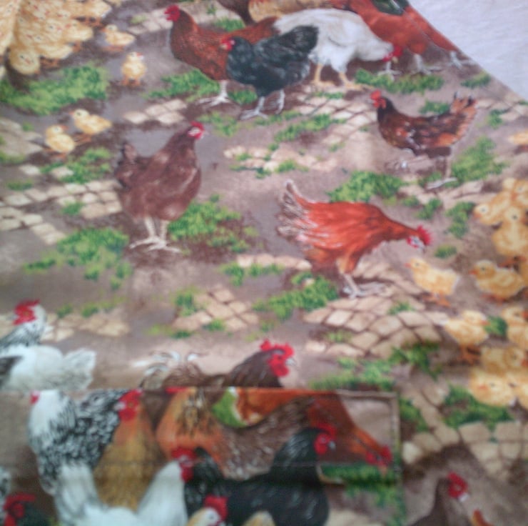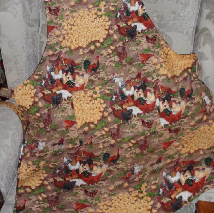 The design on this apron is Chickens, Chicks and Cockerels in the Farmyard.