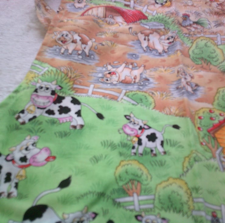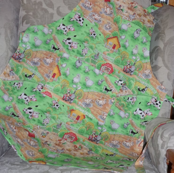 The design on this apron is of a Cartoon style farm yard with all you would expect to find including the farmer on his tracker, sheep dog, cows, pigs, chickens and sheep along with farm buildings.