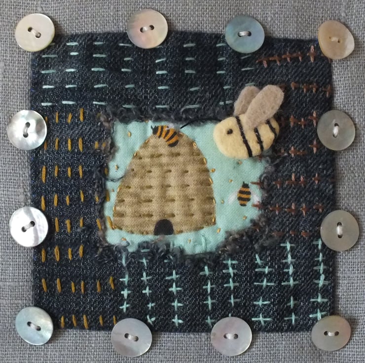 I made the hole in the denim as i needed it to be big enough to show the beehive and bees fabric and then used the traditional Japanese running stitch and cross stitch for the Boro bit.