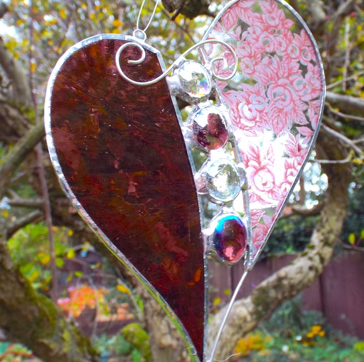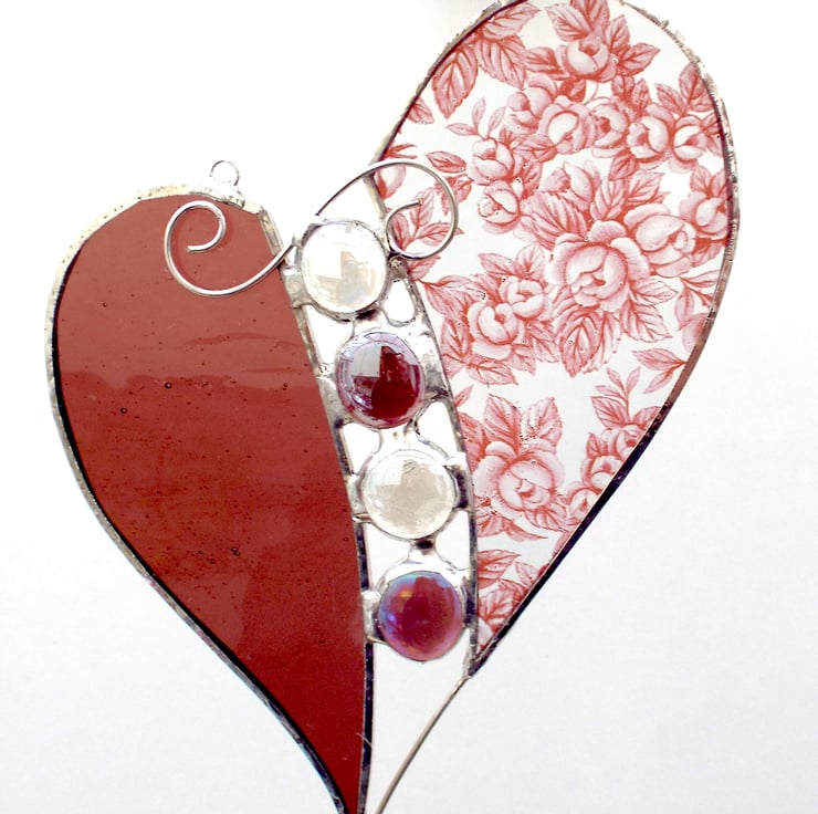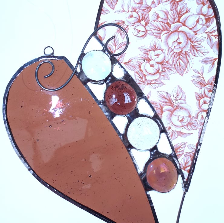 A romantic 2-piece heart made using the Tiffany (copper foiled) method of stained glass. The heart is made up of two parts; one half a deep rose coloured glass, and the other a lovely rose floral pattern. The two halves are divided by 4 glass nuggets, two clear, and two purple. The heart also features an elegant wire curl at the top, and is complete with a clear nylon hanging thread.