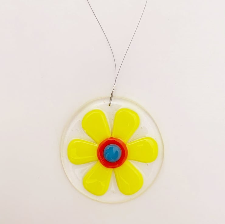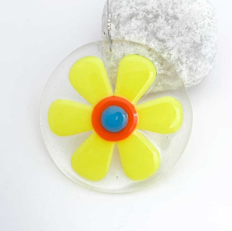 Fused glass retro yellow flower suncatcher, perfect in a window, or anywhere you fancy. Inspired by my love of the retro design found on the ceramics, fabrics and wallpaper of the 1960s and 1970s. This would made a groovy gift for lovers of all things retro.