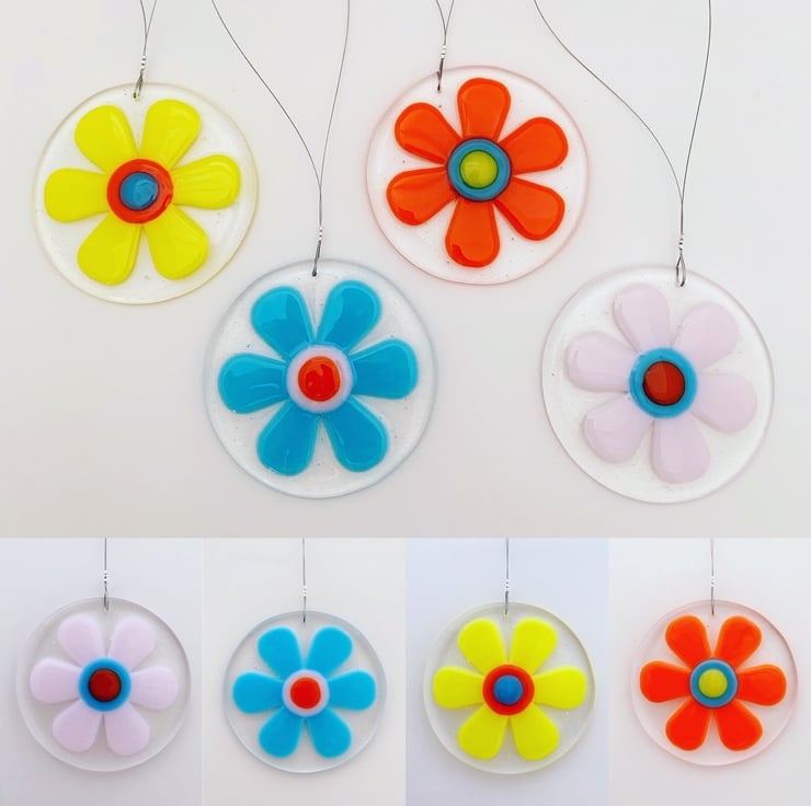 To make this, I cut 2 circles from transparent art glass and fuse them overnight in my kiln. I then hand cut and shape yellow, turquoise and orange opaque art glass, making petal and circle shapes. I then arrange them on the pre-fired circle and fire the piece a second time to slowly tack fuse the flower into place. Transparent glass with yellow petals and turquoise and orange centre. All glass is hand cut and assembled, therefore no 2 are exactly the same. One Supplied.