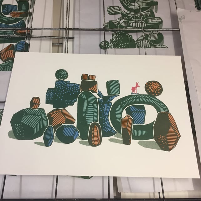 I'm also a big fan of abstract sculpture, so these works let me enjoy the process of making such things. The monoliths start out as plasticine sculptures which I make and then photograph, then create the linocut/screen-print. It is quite a process!