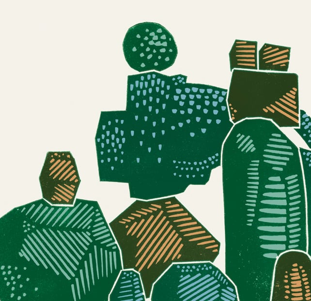 This print is a follow-up to my first series of 'donkey monolith' compositions, in which donkeys explore a sculptural landscape. In this print, one donkey is enjoying itself, contemplating a collection of these monoliths. I have created a lot of donkey-themed prints over the years, as I feel drawn towards their modest nature. I like to celebrate them and imagine them have all sorts of interesting times and adventures when not being watched or bothered by anyone.
