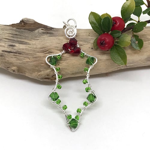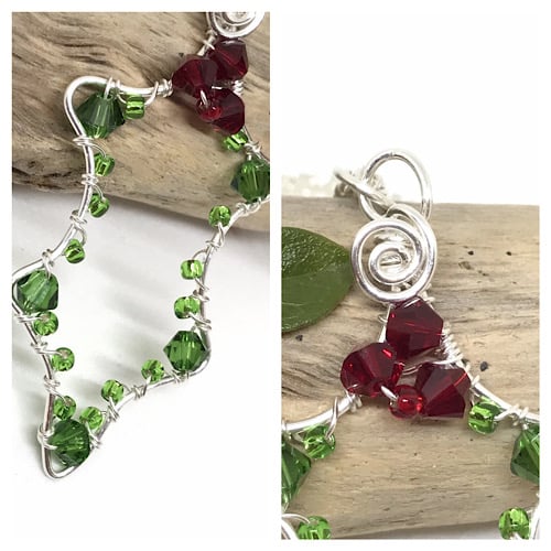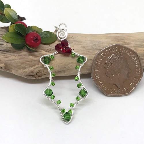 I have formed silver filled wire into a holly leaf shape and wrapped beautiful sparkling Swarovski® crystals and seed beads around. Deep red crystals for the berries and green for the leaves.