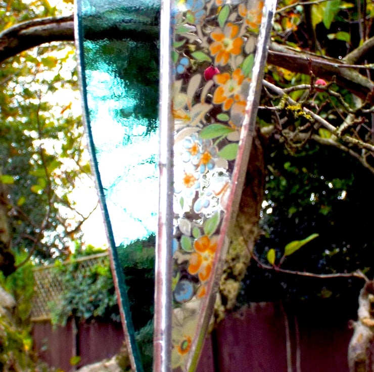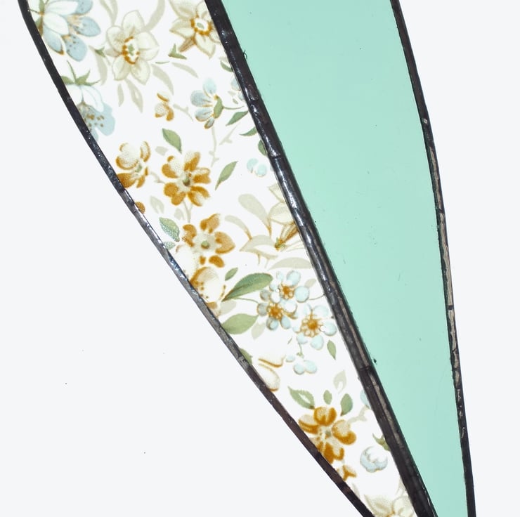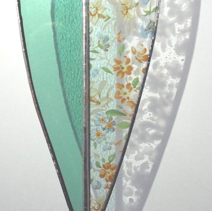 An elegant two-tone heart made using the Tiffany (copper foiled) method of stained glass. This long heart is comprised of 2 pieces of glass, one side is a pale sea-green colour, and the other is lovely floral decal glass. There is a small silver coloured "made with love" heart hanging on the end of the decoration, and two small silver beads and a larger turquoise bead sit on the clear nylon hanging thread.