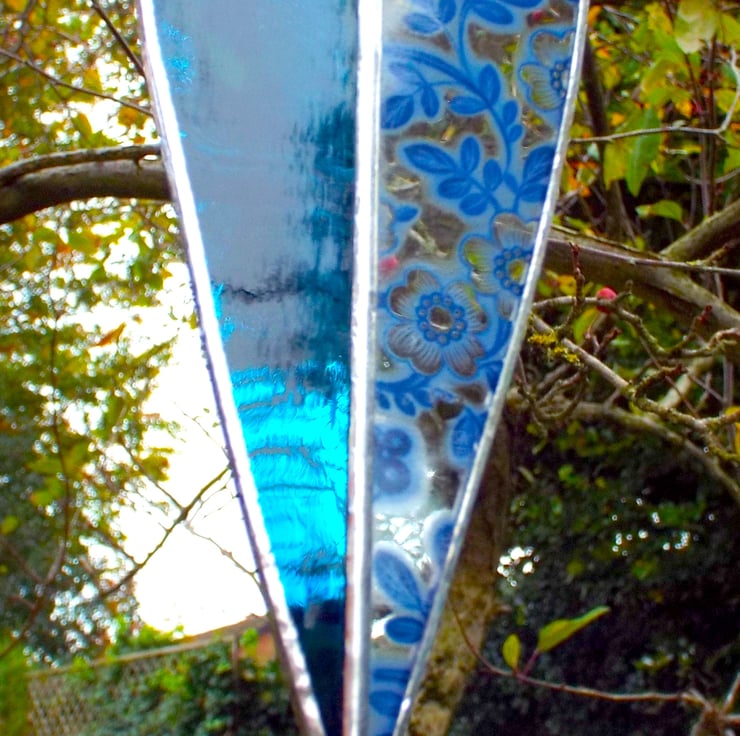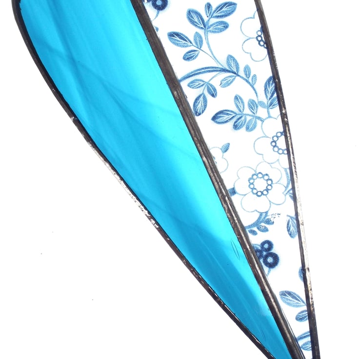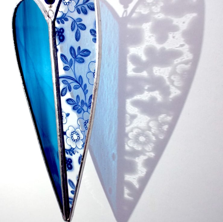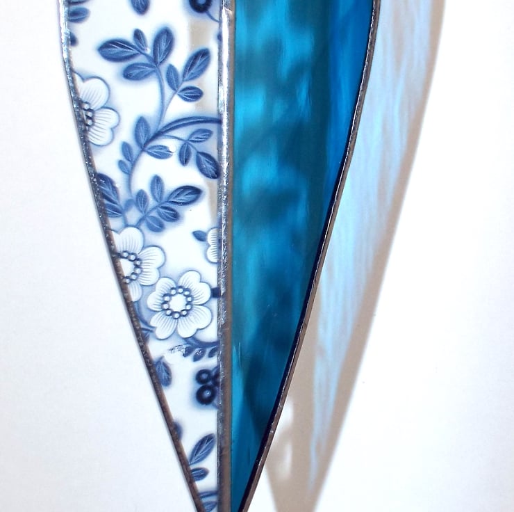 An elegant two-tone heart made using the Tiffany (copper foiled) method of stained glass. This long heart is comprised of 2 pieces of glass, one side is a streaky blue colour, and the other is lovely floral blue decal glass. There is a small silver coloured "made with love" heart hanging on the end of the decoration, and two small silver beads and a larger deep blue bead sit on the clear nylon hanging thread.
