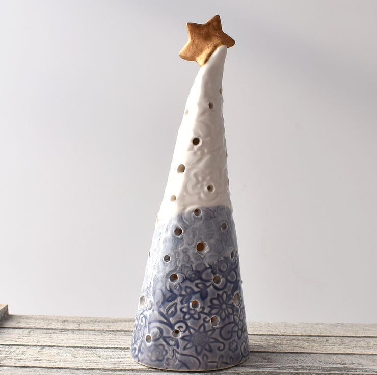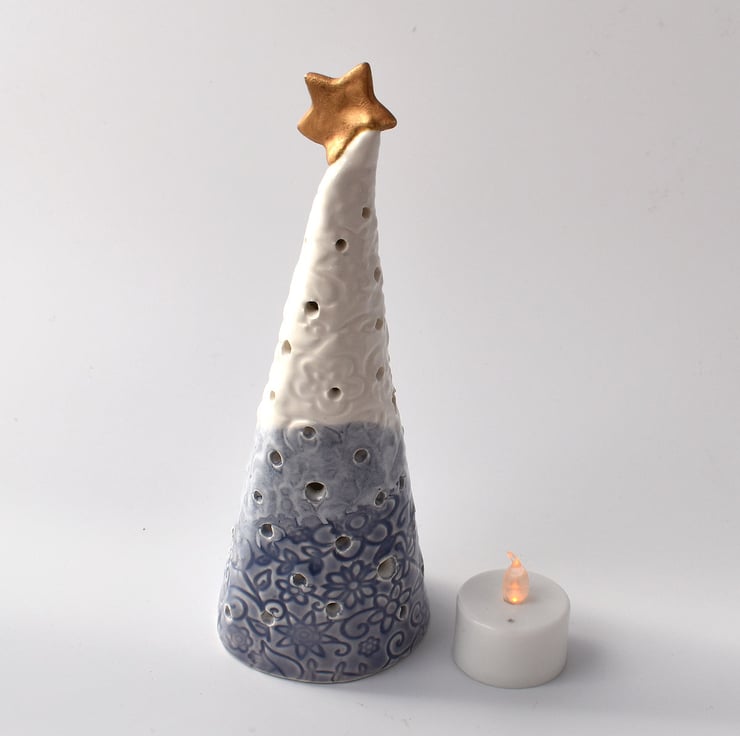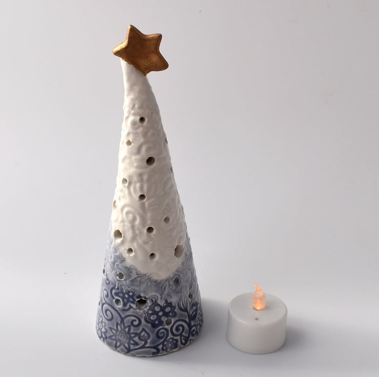 A cone shaped pottery Christmas tree with LED tea light included, standing around 18.5cm tall.
