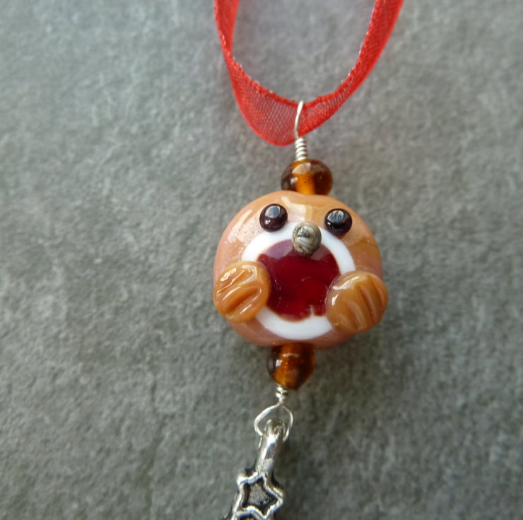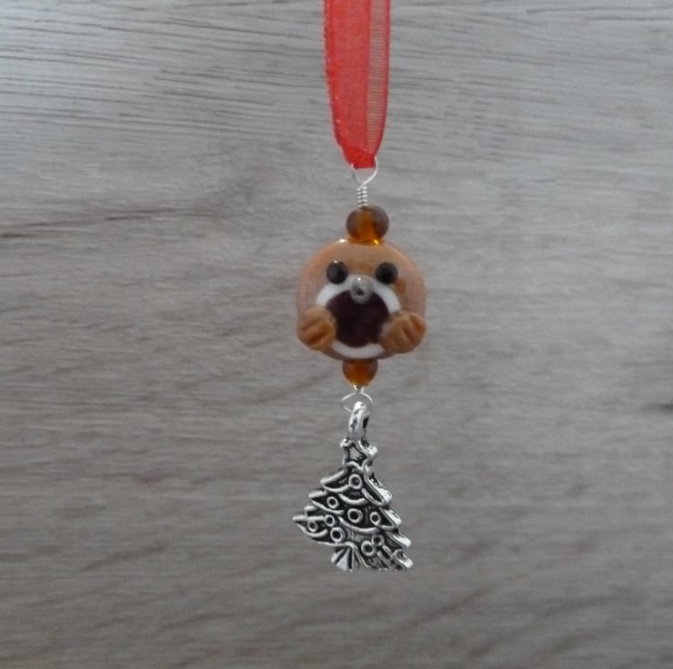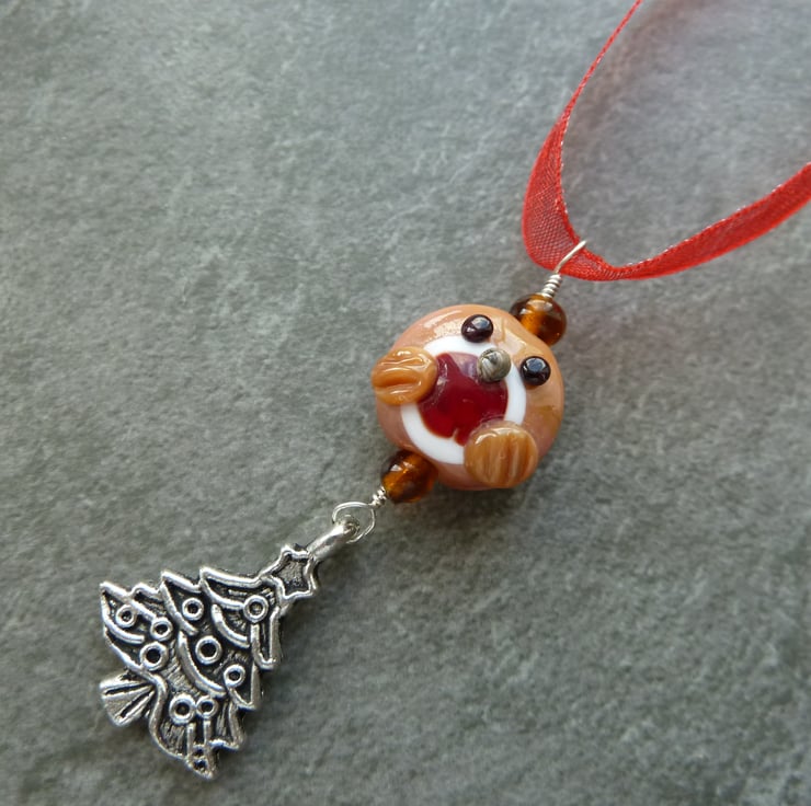 A Christmas tree decoration made with red ribbon and a handmade lampwork glass robin bead. It also features a silver plated tree charm.