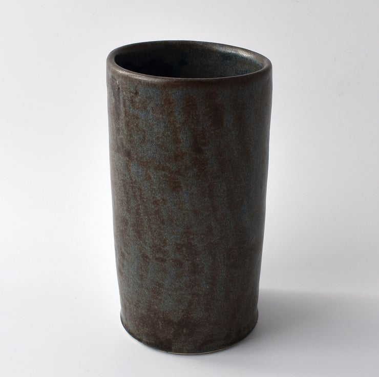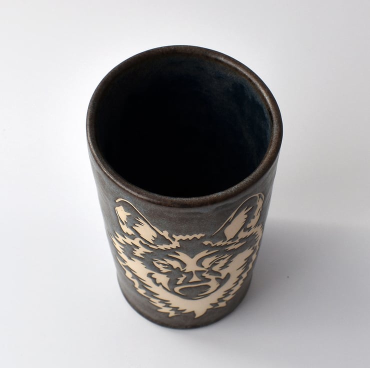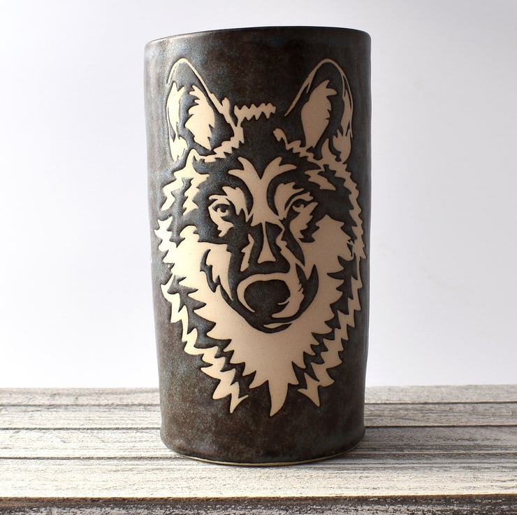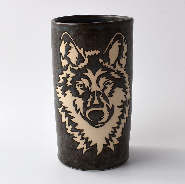 A hand thrown tubular vase with a stencilled wolf design in satin matte glaze and measuring 14.5cm high.