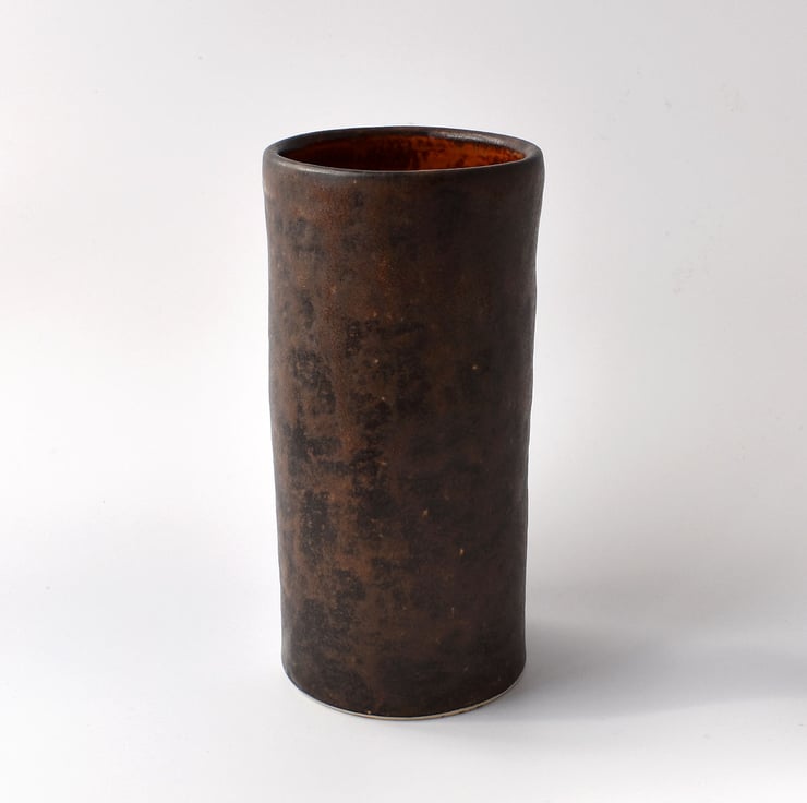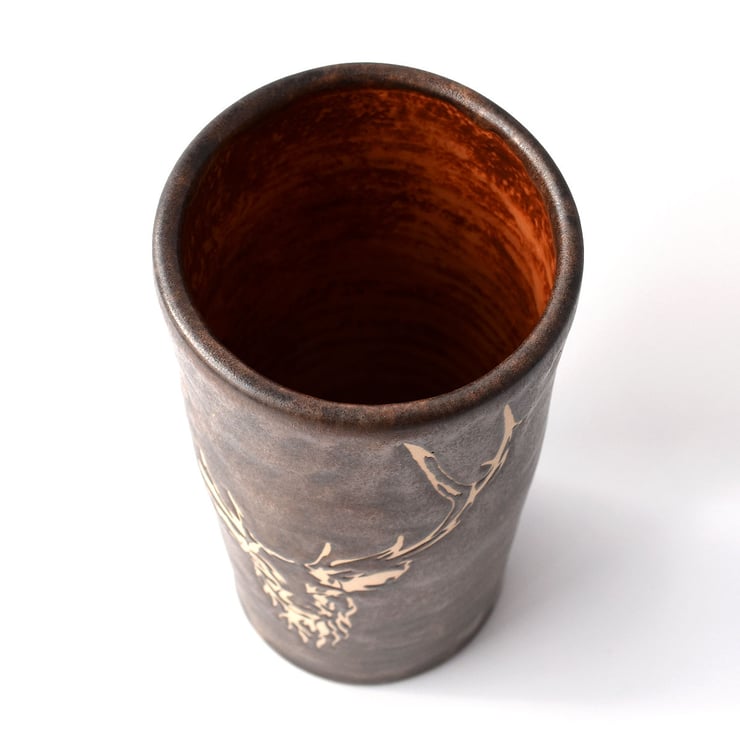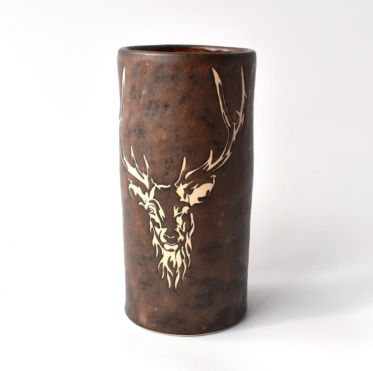 A hand thrown tubular vase with a stencilled stag design in satin matte glaze and measuring 17cm high.
