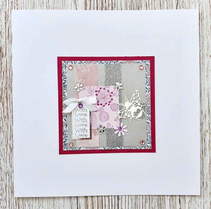 Birthday card - handmade large birthday card cut from quality patterned and plain card stocks. Embellished with a cream bumble bee, faux diamonds and pink sapphires to give it added sparkle. A 'With Love' sentiment is attached.
