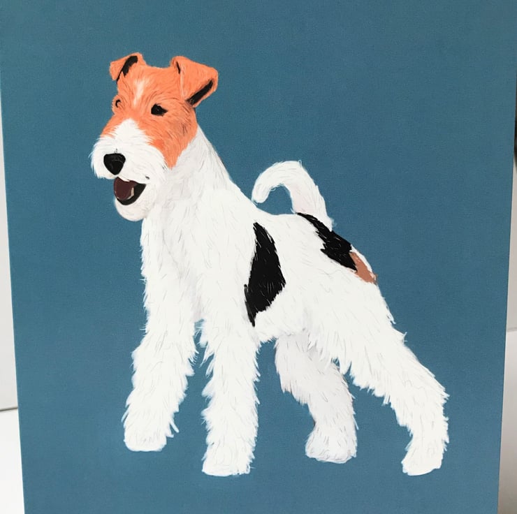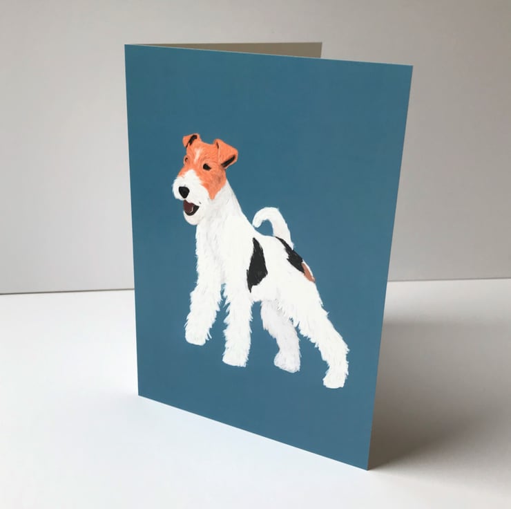 This card is a reproduction of one of my digital drawings of a Fox Terrier stood on a blue background, with a vintage feel.