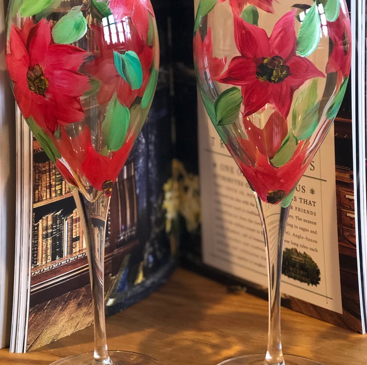 Two hand painted poinsettia wine glasses. The glasses are a unique gift or treat and look stunning on a Christmas table.