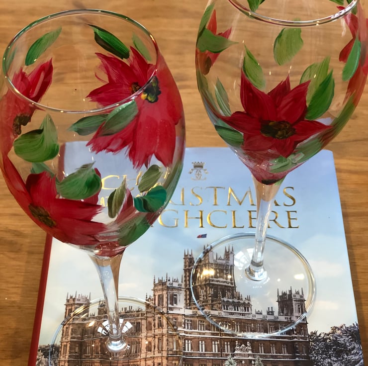 Two hand painted poinsettia wine glasses. The glasses are a unique gift or treat and look stunning on a Christmas table.