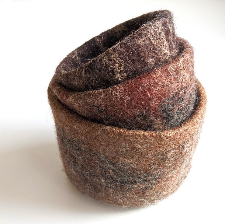 This trio is made from undyed Blue Faced Leicester wool and three toning autumnal shades of merino wool wet felted together, and embellished with viscose and silk fibres for highlights and depth, to create an almost ceramic looking felt. I was aiming for a look of traditional stoneware.