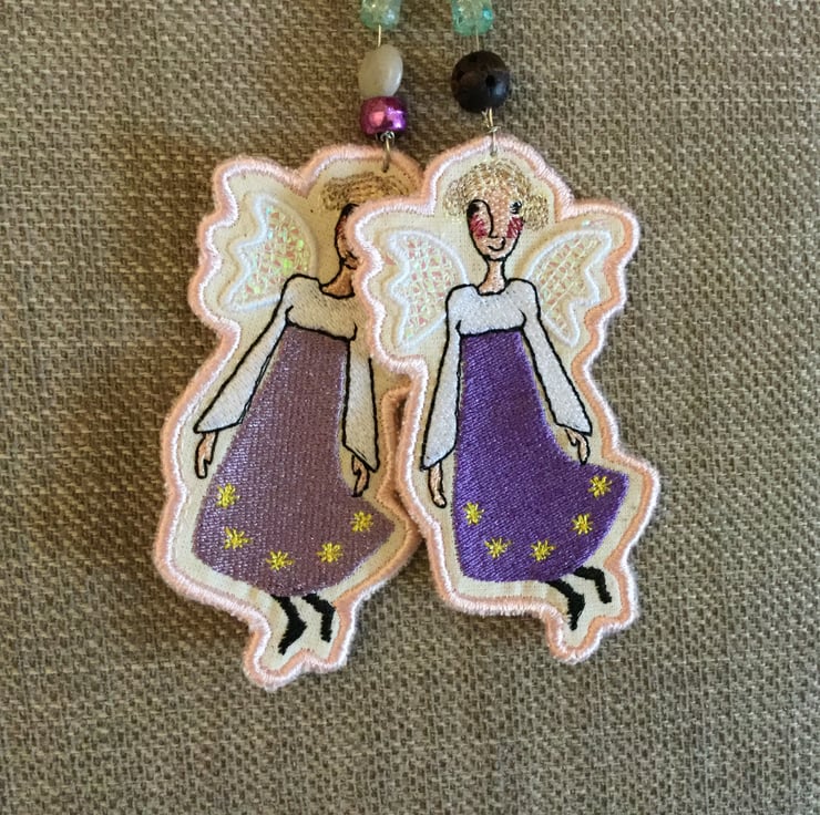 Quirky hanging Embroidered angel decoration which has a beaded wire hanger. Would look lovely hanging in the home, or on your Christmas tree, Christmas wreath, or even as an extra on a present. Made from embroidered cotton, with glittery wings. The angel is 4ins, and the length with the wire hanger is 7.25